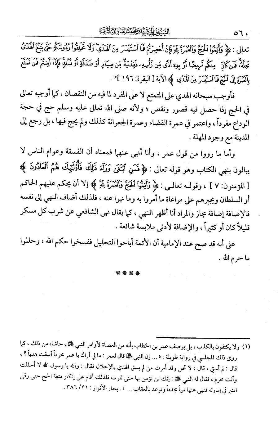 تعالى: {وَأَتِمُّوا الْحَجَّ وَالْعُمْرَةَ لِلَّهِ فَإِنْ أُحْصِرْتُمْ فَمَا اسْتَيْسَرَ مِنَ الْهَدْيِ وَلَا تَحْلِقُوا رُءُوسَكُمْ حَتَّى يَبْلُغَ الْهَدْيُ مَحِلَّهُ فَمَنْ كَانَ مِنْكُمْ مَرِيضًا أَوْ بِهِ أَذًى مِنْ رَأْسِهِ فَفِدْيَةٌ مِنْ صِيَامٍ أَوْ صَدَقَةٍ أَوْ نُسُكٍ فَإِذَا أَمِنْتُمْ فَمَنْ تَمَتَّعَ بِالْعُمْرَةِ إِلَى الْحَجِّ فَمَا اسْتَيْسَرَ مِنَ الْهَدْيِ}. فأوجب سبحانه الهدي على المتمتع لا على المفرد لما فيه من النقصان، كما أوجبه تعالى في الحج إذا حصل فيه قصور ونقص. ولأنه - صلى الله عليه وسلم - حج في حجة الوداع مفردا، واعتمر في عمرة القضاء وعمرة الجعرانة كذلك ولم يحج فيها، بل رجع إلى المدينة مع وجود المهلة.