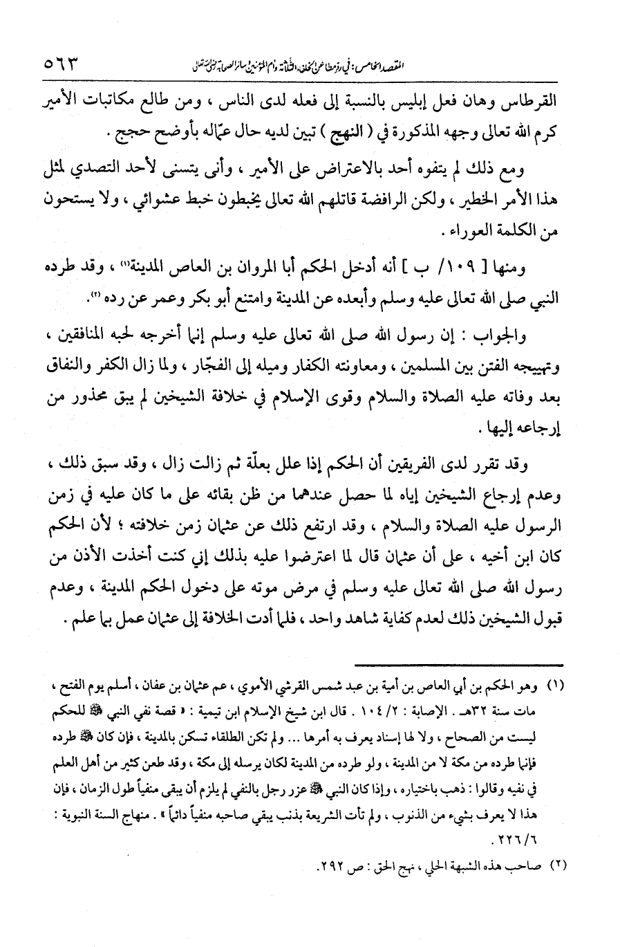 ومنها أنه أدخل الحكم أبا المروان ابن أبي العاص المدينة، وقد طرده النبي - صلى الله عليه وسلم - وأبعده عن المدينة وامتنع أبو بكر وعمر عن رده.