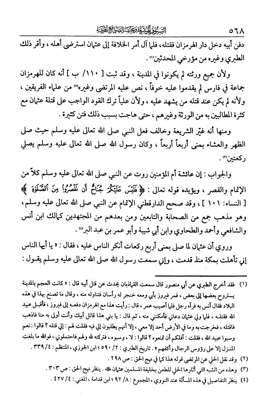 ومنها أنه غير الشريعة وخالف فعل النبي - صلى الله عليه وسلم - حيث صلى الظهر والعصر بمنى أربعا أربعا، وكان رسول الله - صلى الله عليه وسلم - يصلي ركعتين.