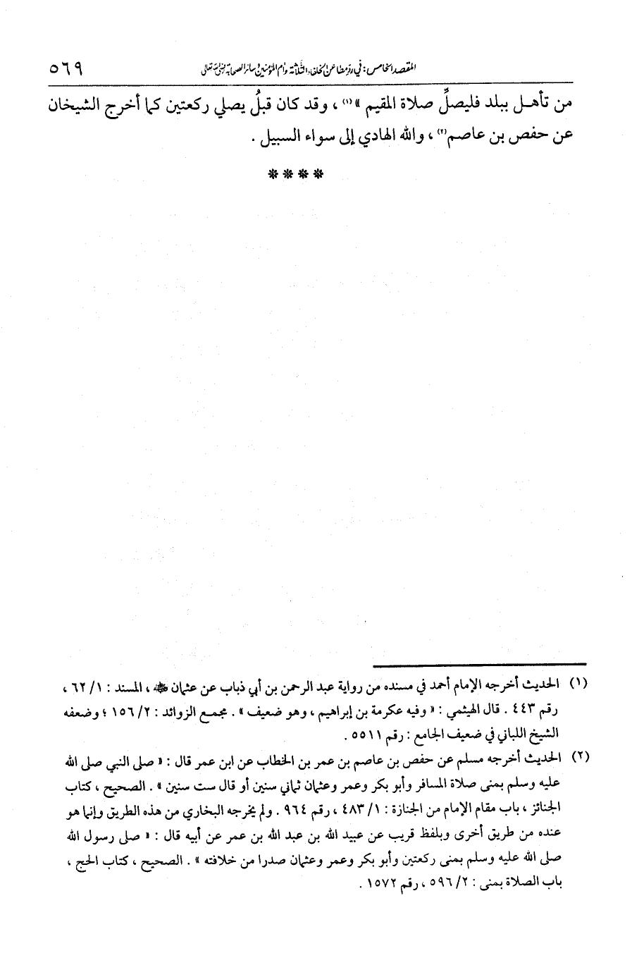 من تأهل ببلد فليصل صلاة المقيم". وقد كان قبل يصلي ركعتين كما أخرج الشيخان عن حفص بن عاصم. والله الهادي إلى سواء السبيل.