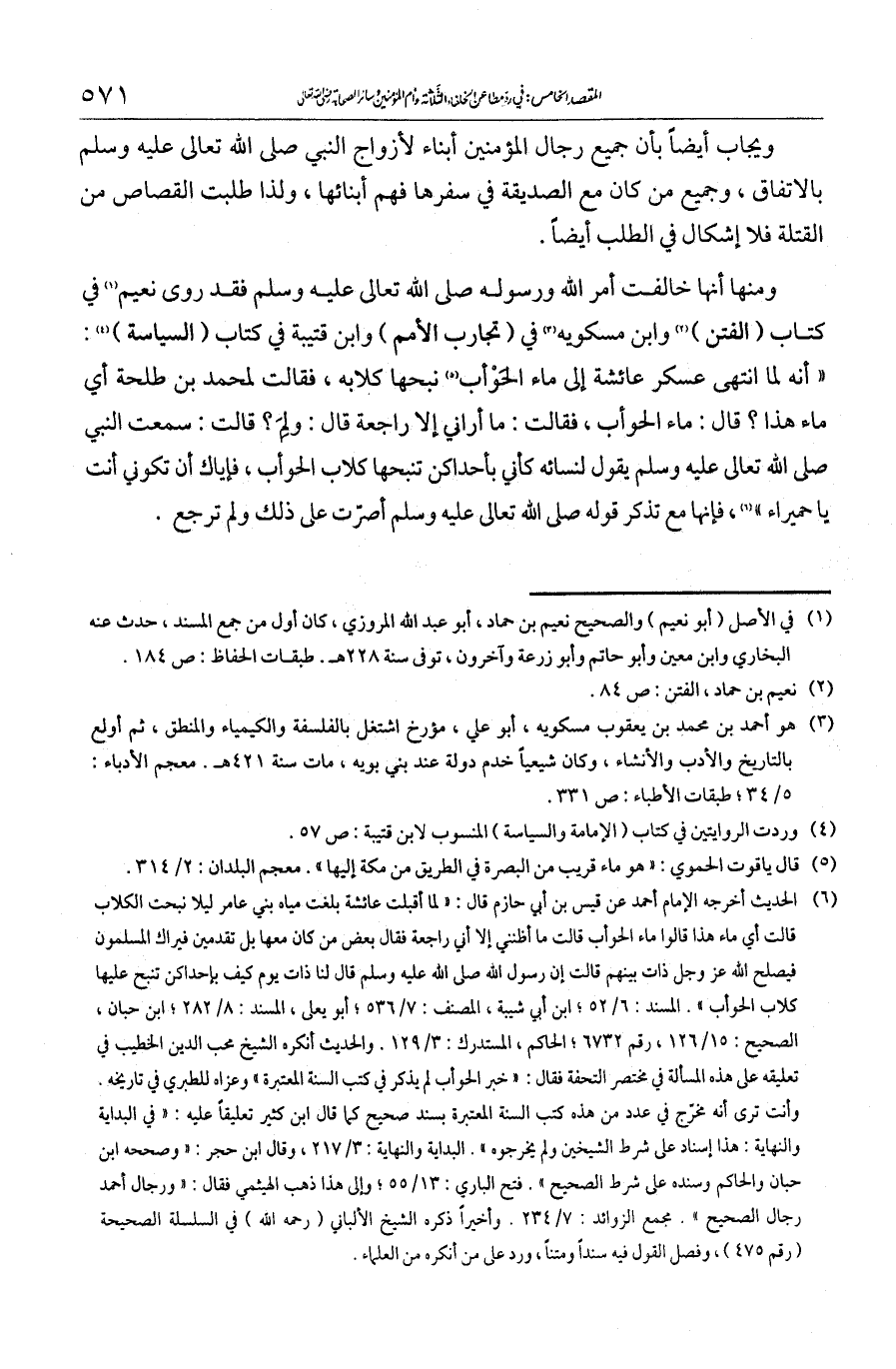 ويجاب أيضا بأن جميع رجال المؤمنين أبناء لأزواج النبي - صلى الله عليه وسلم - بالاتفاق، وجميع من كان مع الصديقة في سفرها فهم أبناؤها. ولذا طلبت القصاص من القتلة، فلا إشكال في الطلب أيضا.