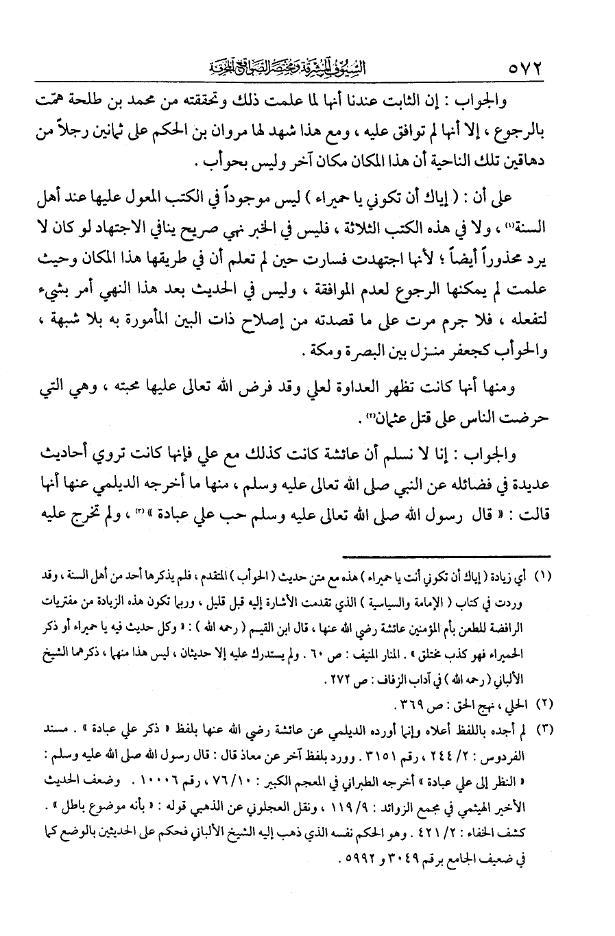 والجواب أن الثابت عندنا أنها لما علمت ذلك وتحققته من محمد بن طلحة همّت بالرجوع إلا أنها لم توافق عليه، ومع هذا شهد لها مروان بن الحكم على ثمانين رجلا من دهاقين تلك الناحية أن هذا المكان مكان آخر وليس بحوأب. على أن "إياك أن تكوني يا حميراء" ليس موجودا في الكتب المعول عليها عند أهل السنة، ولا في الكتب الثلاثة. فليس في الخبر نهي صريح ينافي الاجتهاد، [على أنه] لو كان فلا يرد محذور أيضا لأنها اجتهدت فسارت حين لم تعلم أن في طريقها هذا المكان، وحيث علمت لم يمكنها الرجوع لعدم الموافقة. وليس في الحديث بعد هذا النهي أمر بشيء لتفعله، فلا جرم مرت على ما قصدته من إصلاح ذات البين المأمورة به بلا شبهة. والحوأب كجعفر منزل بين البصرة ومكة.