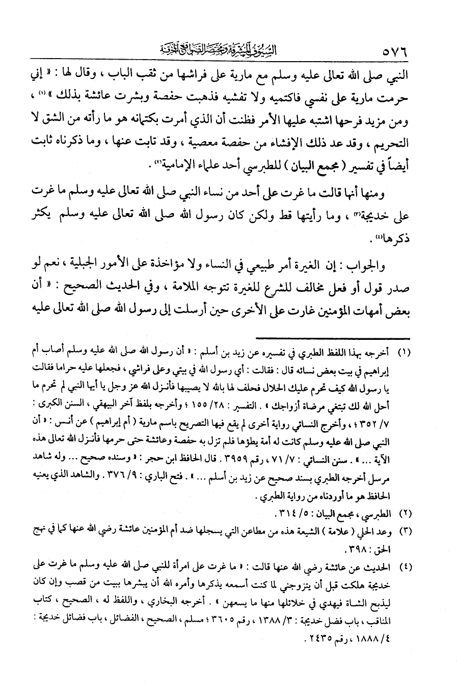 النبي - صلى الله عليه وسلم - مع مارية في فراشها من ثقب الباب، وقال لها: إني حرمت مارية على نفسي فاكتميه ولا تفشيه، فذهبت حفصة وبشرت عائشة بذلك. ومن مزيد فرحها اشتبه عليها الأمر فظنت أن الذي أمرت بكتمانه هو ما رأته من الشق لا التحريم. وقد عد ذلك الإفشاء من حفصة معصية وقد تابت عنها. وما ذكرناه ثابت أيضا في تفسير مجمع البيان للطبرسي أحد علماء الإمامية.