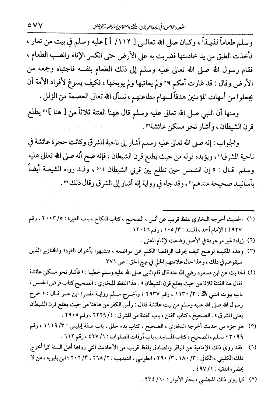 والجواب أنه - صلى الله عليه وسلم - أشار إلى ناحية المشرق وكانت حجرة عائشة في ناحية المشرق. ويؤيده قوله: "من حيث يطلع قرن الشيطان". فإنه صح أنه - صلى الله عليه وسلم - قال إن الشمس حين تطلع "تطلع بين قرني الشيطان". وقد رواه الشيعة بأسانيد صحيحة عندهم. وقد جاء في رواية أنه أشار إلى الشرق وقال ذلك.