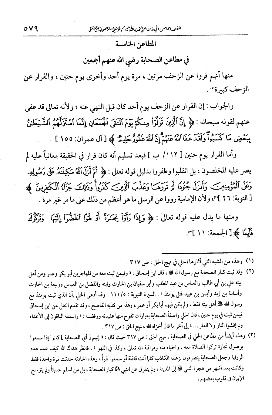 المطاعن الخامسة في الصحابة رضي الله تعالى عنهم أجمعينمنها أنهم فروا عن الزحف مرتين، مرة يوم أحد وأخرى يوم حنين، والفرار عن الزحف كبيرة.