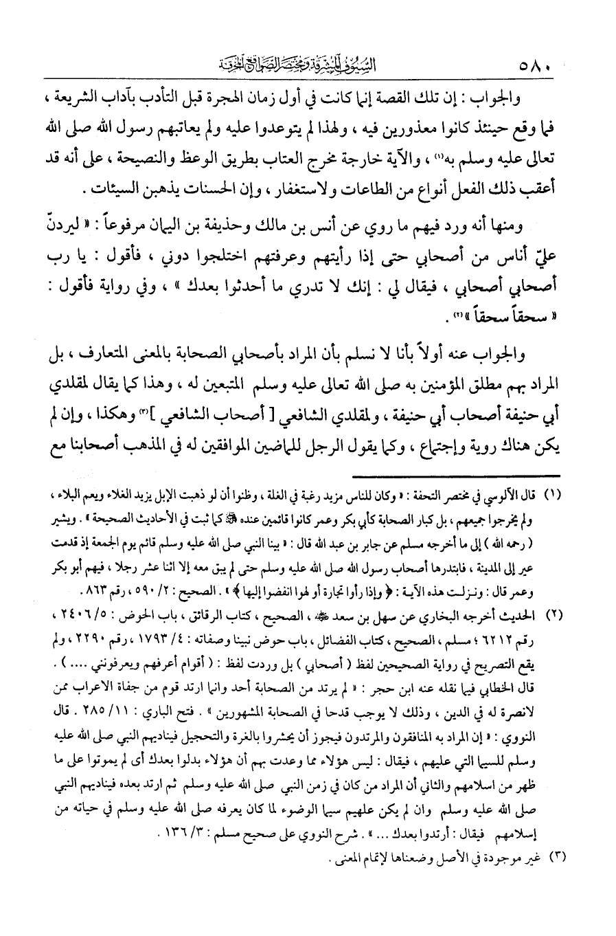 والجواب عنه أولا بأنا لا نسلم بأن المراد بأصحابي الصحابة بالمعنى المتعارف، بل المراد بهم مطلق المؤمنين به - صلى الله عليه وسلم - المتبعين له. وهذا كما يقال لمقلدي أبي حنيفة أصحاب أبي حنيفة ولمقلدي الشافعي [أصحاب الشافعي] وهكذا، وإن لم يكن هناك رؤية واجتماع، وكما يقول الرجل للماضين الموافقين له في المذهب أصحابنا، مع