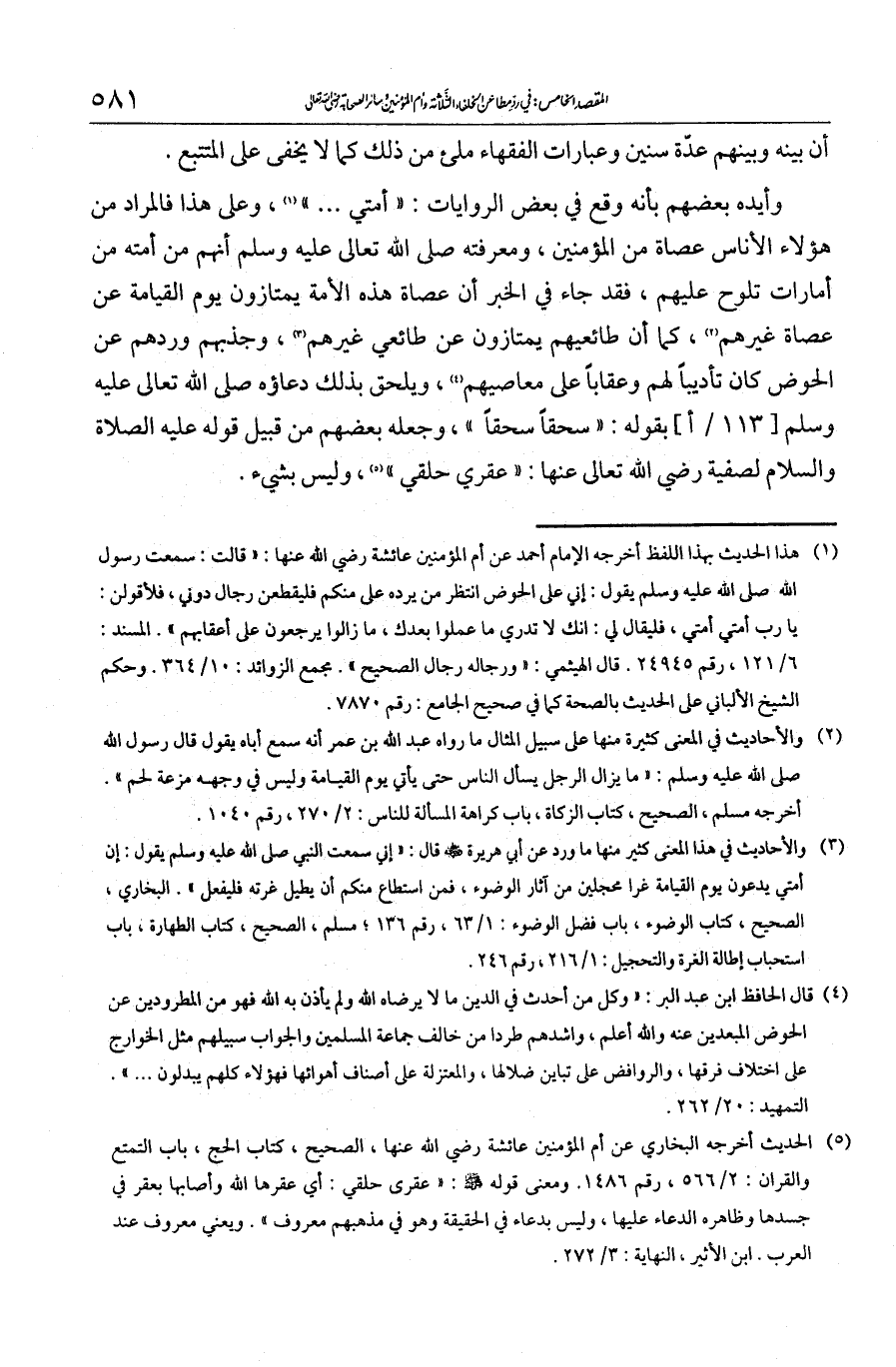 بينه وبينهم عدة سنين. وعبارات الفقهاء ملأى من ذلك كما لا يخفى على المتتبع. وأيده بعضهم بأنه وقع في بعض الروايات: "أمتي"، وعلى هذا فالمراد من هؤلاء الأناس عصاة من المؤمنين. ومعرفته - صلى الله عليه وسلم - أنهم من أمته من أمارات تلوح عليهم، فقد جاء في الخبر أن عصاة هذه الأمة يمتازون يوم القيامة عن عصاة غيرهم، كما أن طائعيهم يمتازون عن طائعي غيرهم. وجذبهم وردهم عن الحوض كان تأديبا لهم وعقابا على معاصيهم. ويلحق بذلك دعاؤه - صلى الله عليه وسلم - بقوله: "سحقا سحقا"، وجعله بعضهم من قبيل قوله عليه الصلاة والسلام لصفية رضي الله تعالى عنها: "عقرى حلقى"، وليس بشيء.