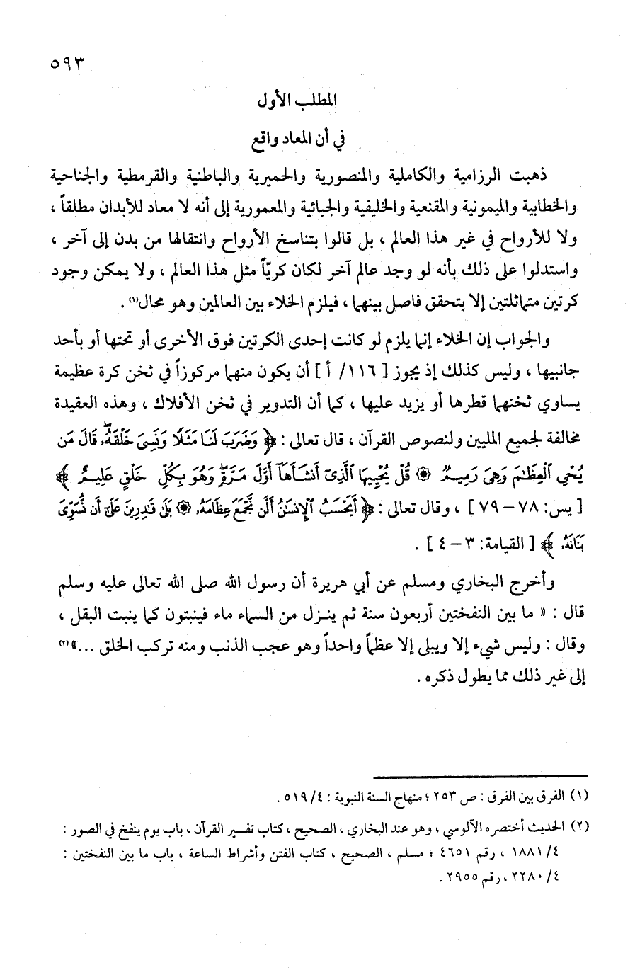 والجواب أن الخلاء إنما يلزم لو كانت إحدى الكرتين فوق الأخرى أو تحتها أو بأحد جانبيها وليس كذلك، إذ يجود أن يكون منهما مركوزا في ثخن كرة عظيمة يساوي ثخنها قطرها أو يزيد عليها، كما أن التدوير في ثخن الأفلاك. وهذه العقيدة مخالفة لجميع المليين ولنصوص القرآن. قال تعالى: {وَضَرَبَ لَنَا مَثَلًا وَنَسِيَ خَلْقَهُ قَالَ مَنْ يُحْيِي الْعِظَامَ وَهِيَ رَمِيمٌ * قُلْ يُحْيِيهَا الَّذِي أَنْشَأَهَا أَوَّلَ مَرَّةٍ وَهُوَ بِكُلِّ خَلْقٍ عَلِيمٌ} وقال تعالى: {أَيَحْسَبُ الْإِنْسَانُ أَلَّنْ نَجْمَعَ عِظَامَهُ * بَلَى قَادِرِينَ عَلَى أَنْ نُسَوِّيَ بَنَانَهُ}. وأخرج البخاري ومسلم عن أبي هريرة أن رسول الله - صلى الله عليه وسلم - قال: "ما بين النفختين أربعون سنة ثم ينزل من السماء ماء فينبتون كما ينبت البقل" وقال: "ليس شيء إلا ويبلى إلا عظما واحدا وهو عجب الذنب ومنه تركب الخلق" إلى غير ذلك مما يطول ذكره.