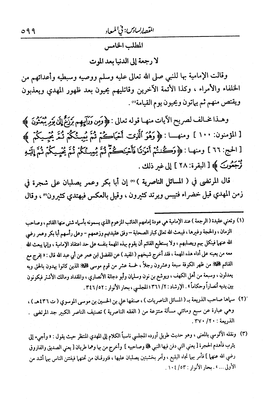 وقالت الإمامية بها للنبي - صلى الله عليه وسلم - ووصيه وسبطيه وأعدائهم من الخلفاء والأمراء، وكذا الأئمة الآخرين وقاتليهم يحيون بعد ظهور المهدي ويعذبون ويقتص منهم ثم يماتون ويحيون يوم القيامة.