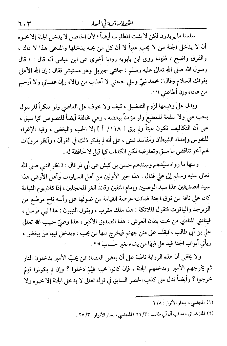 ولا يخفى أن هذه الرواية ناصّة على أن بعض العصاة ممن يحب الأمير يدخلون النار ثم يخرجهم الأمير ويدخلهم الجنة، فإن كانوا محبيه فلمَ دخلوا؟ وإن لم يكونوا فلمَ خرجوا؟ وأيضا تدل على كذب الحصر السابق في قوله تعالى: لا يدخل الجنة إلا محبوه ولا
