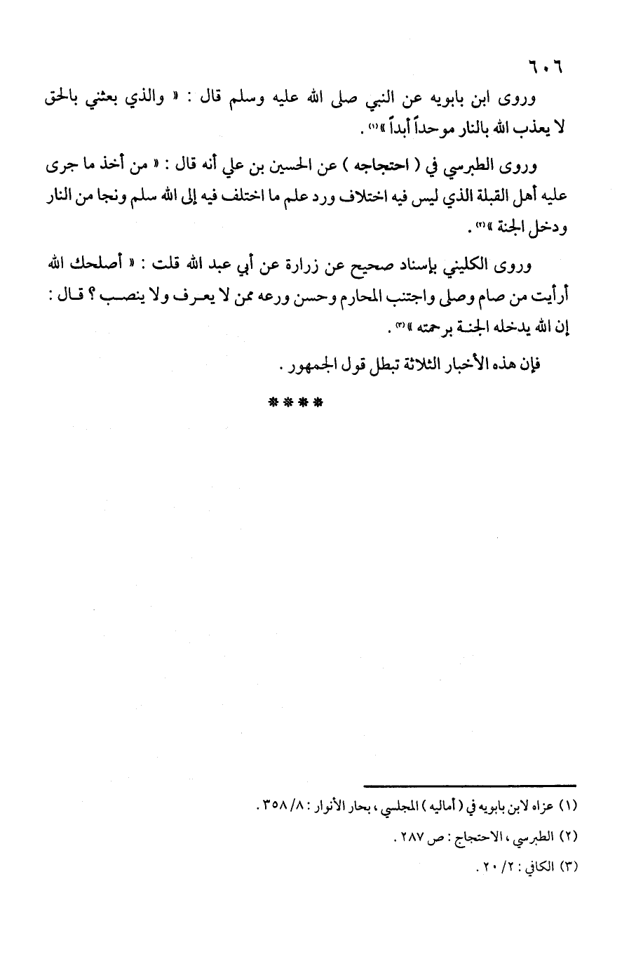 وروى الكليني بإسناد صحيح عن زرارة عن أبي عبد الله قلت: أصلحك الله أرأيت من صام وصلى واجتنب المحارم وحسن ورعه ممن لا يعرف ولا ينصب؟ قال: إن الله يدخله الجنة برحمته.