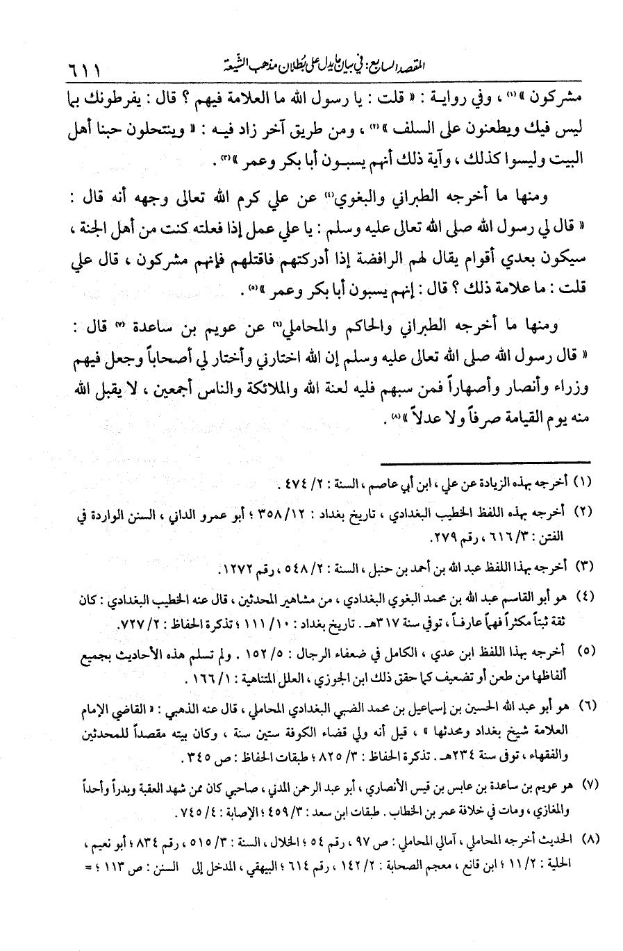 ومنها ما أخرجه الطبراني والبغوي عن علي كرم الله تعالى وجهه أنه قال: "قال لي رسول الله - صلى الله عليه وسلم -: يا علي عمل إذا فعلته كنت من أهل الجنة، سيكون بعدي أقوام يقال لهم الرافضة إذا أدركتهم فاقتلهم فإنهم مشركون، قال علي: ما علامة ذلك؟ قال: إنهم يسبون أبا بكر وعمر".