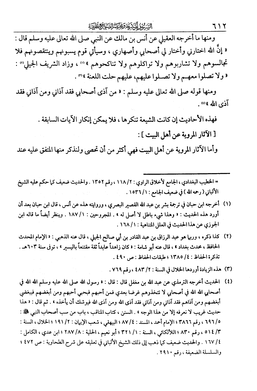 ومنها ما أخرجه العقيلي عن أنس بن مالك عن النبي - صلى الله عليه وسلم - قال: "إن الله اختارني واختار لي أصحابي وأصهاري، وسيأتي قوم يسبونهم وينتقصونهم فلا تجالسوهم ولا تشاربهوه ولا تواكلوهم ولا تناكحوهم". وزاد الشريف الجيلي: "ولا تصلوا معهم ولا تصلوا عليهم، عليهم حلت اللعنة".