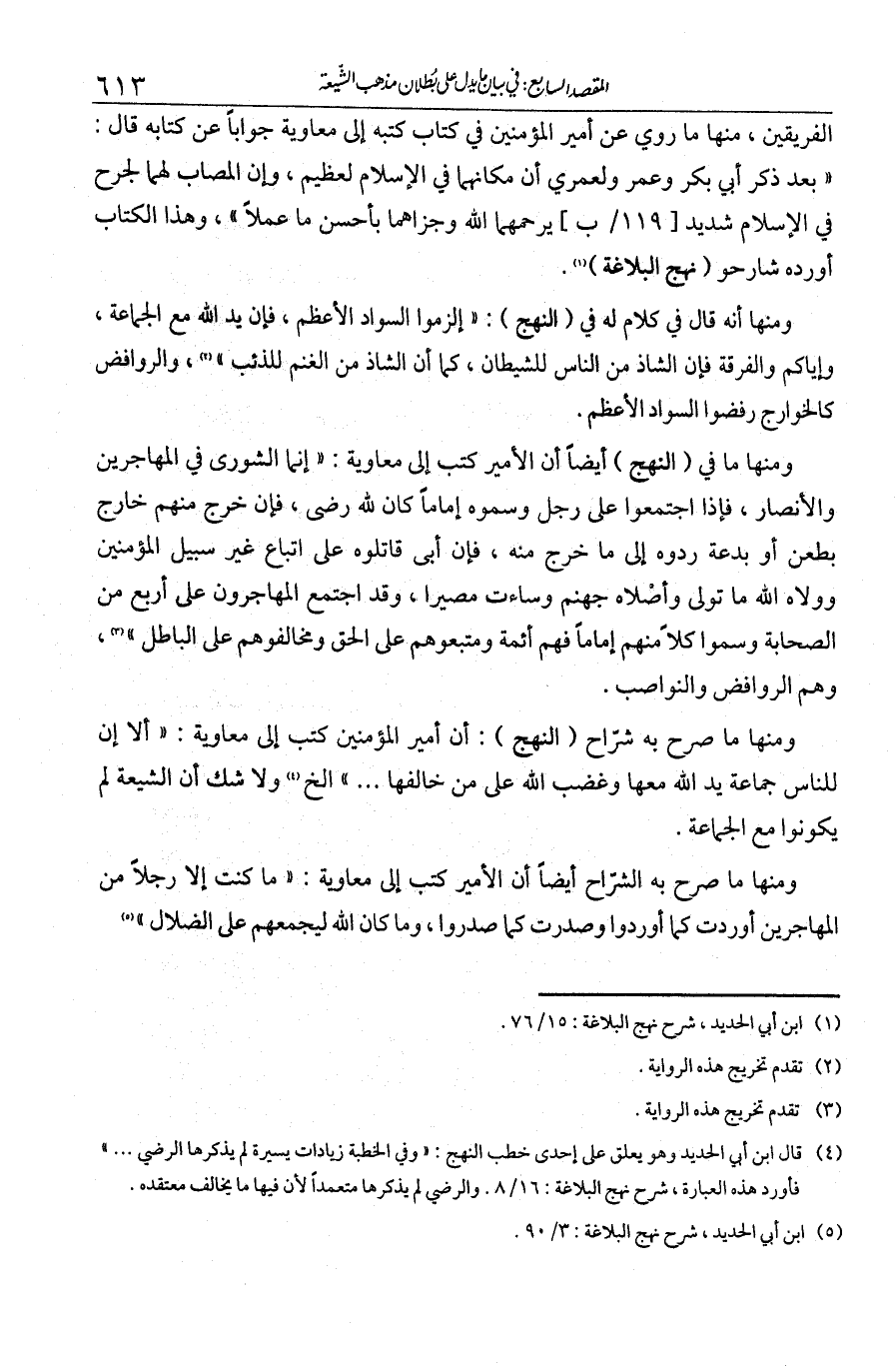 ومنها ما صرح به شراح النهج أن أمير المؤمنين كتب إلى معاوية: "ألا إن للناس جماعة يد الله معها وغضب الله على من خالفها" الخ. ولا شك أن الشيعة لم يكونوا مع الجماعة.