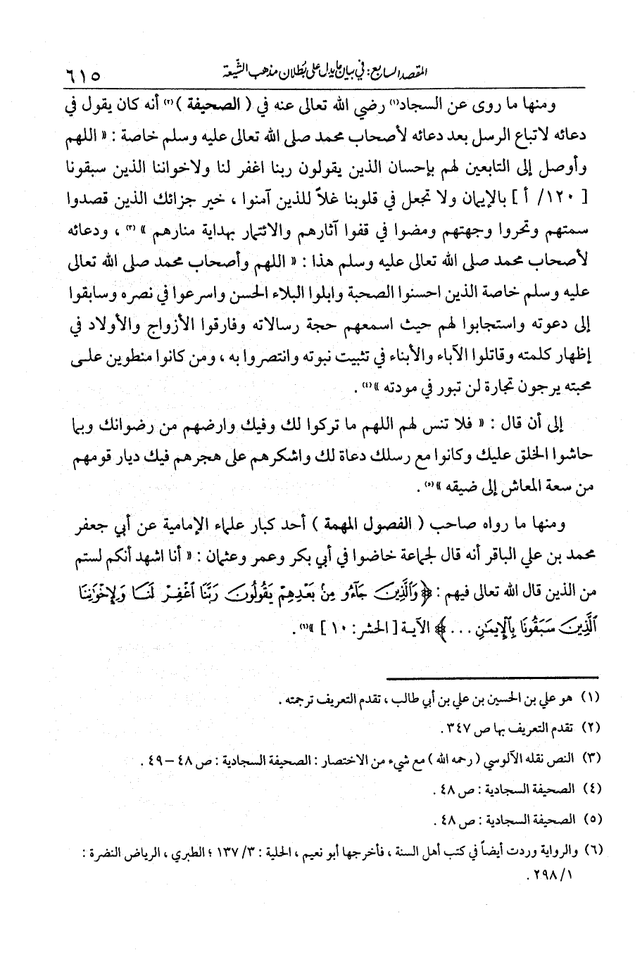 ومنها ما روي عن السجاد رضي الله تعالى عنه في الصحيفة أنه كان يقول في دعائه لأتباع الرسل بعد دعائه لأصحاب محمد - صلى الله عليه وسلم - خاصة: "اللهم وأوصل إلى التابعين لهم بإحسان الذي يقولون ربنا اغفر لنا ولإخواننا الذين سبقونا بالإيمان ولا تجعل في قلوبنا غلا للذين آمنوا خير جزائك، الذين قصدوا سمتهم وتحروا وجهتهم ومضوا في قفو آثارهم والائتمام بهداية منارهم"، ودعائه لأصحاب محمد - صلى الله عليه وسلم - هذا: "اللهم وأصحاب محمد - صلى الله عليه وسلم - خاصة الذين أحسنوا الصحبة وأبلوا البلاء الحسن وأسرعوا في نصره وسابقوا إلى دعوته واستجابوا له حيث أسمعهم حجة رسالته وفارقوا الأزواج والأولاد في إظهار كلمته وقاتلوا الآباء والأبناء في تثبيت نبوته وانتصروا به، ومن كانوا منطوين على محبته يرجون تجارة لن تبور في مودته"، إلى أن قال: "فلا تنس اللهم ما تركوا لك وفيك وأرضهم من رضوانك وبما حاشوا الخلق عليك وكانوا مع رسلك دعاة لك واشكرهم على هجرهم فيك ديار قومهم من سعة العيش إلى ضيقه".