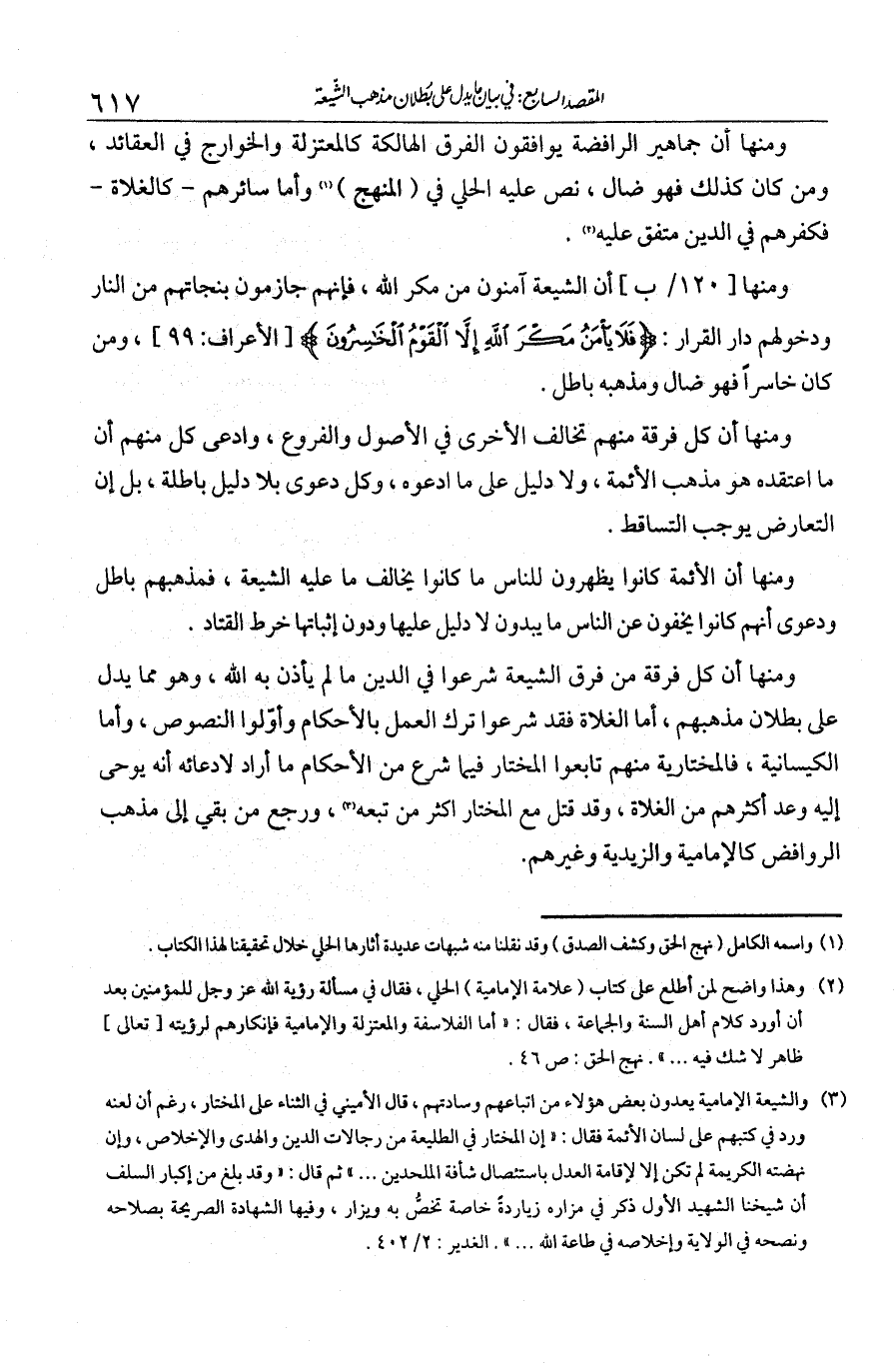 ومنها أن جماهير الرافضة يوافقون الفرق الهالكة كالمعتزلة والخوارج في العقائد، ومن كان كذلك فهو ضال، نص عليه الحلي في المنهج. وأما سائرهم -كالغلاة- فكفرهم في الدين متفق عليه.