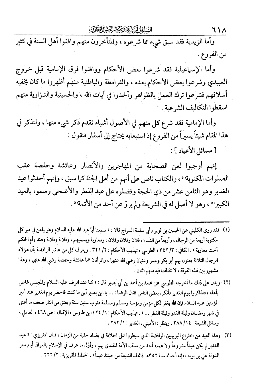 وإنهم أحدثوا عيد الغدير، وهو الثامن عشر من ذي الحجة، وفضلوه على عيد الفطر والأضحى، وسموه بالعيد الكبير. وهو لا أصل له في الشريعة ولم يروَ عن أحد من الأئمة.