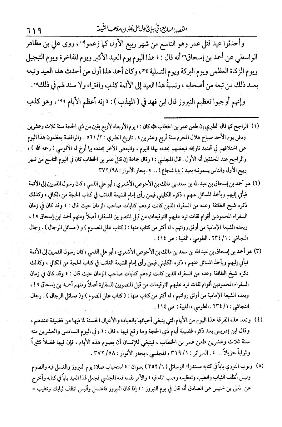 وإنهم أوجبوا تعظيم النيروز. قال ابن فهد في المهذب: «إنه أعظم الأيام»، وهو كذب.