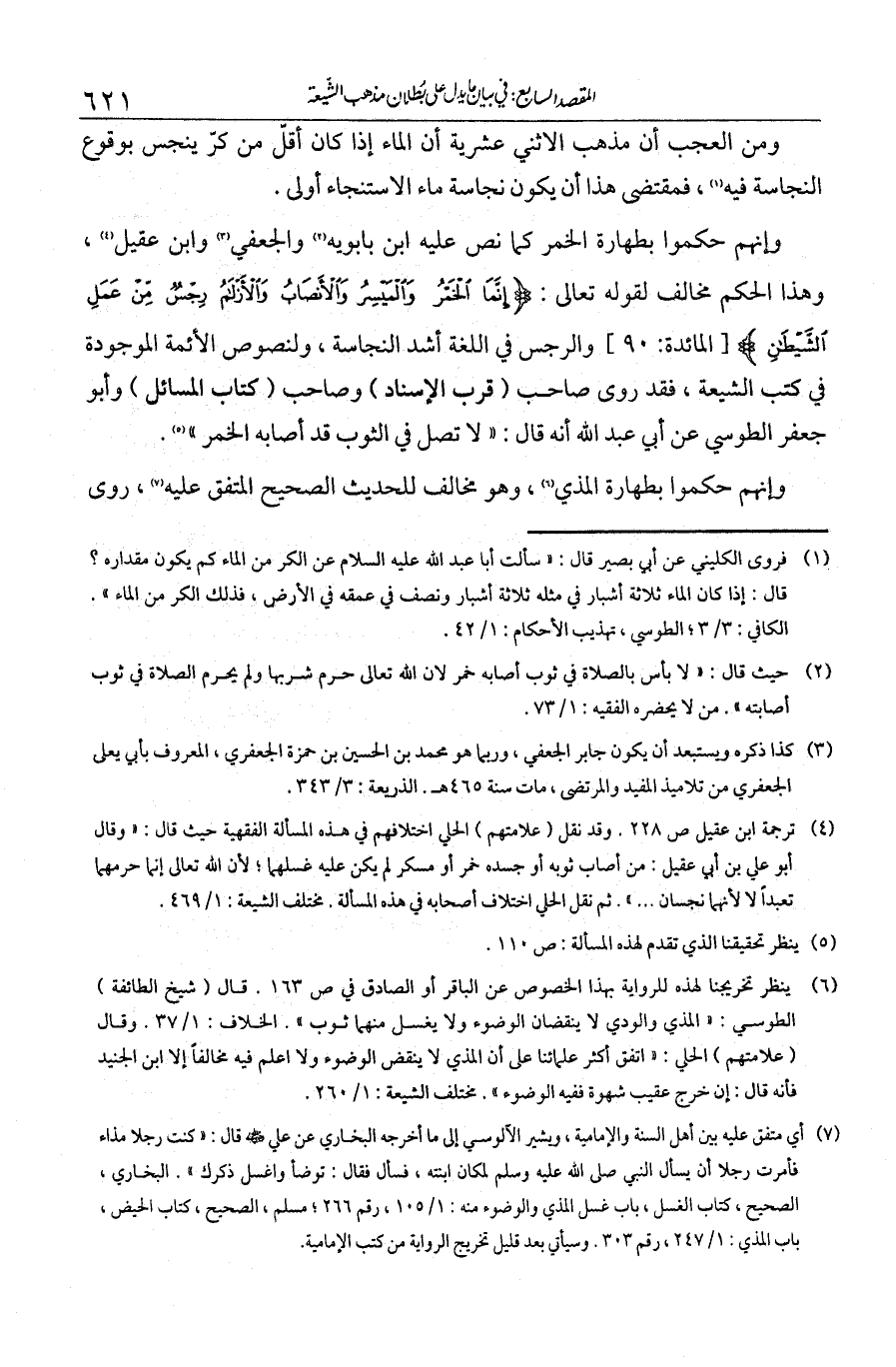 وإنهم حكموا بطهارة الخمر كما نص عليه ابن بابويه والجعفي وابن عقيل، وهذا الحكم مخالف لقوله تعالى: {إِنَّمَا الْخَمْرُ وَالْمَيْسِرُ وَالأَنصَابُ وَالأَزْلامُ رِجْسٌ مِنْ عَمَلِ الشَّيْطَانِ} والرجس في اللغة أشد النجاسة، ولنصوص الأئمة الموجودة في كتب الشيعة، فقد روى صاحب قرب الإسناد وصاحب كتاب المسائل وأبو جعفر الطوسي عن أبي عبد الله أنه قال: «لا تصل في الثوب قد أصابه الخمر».