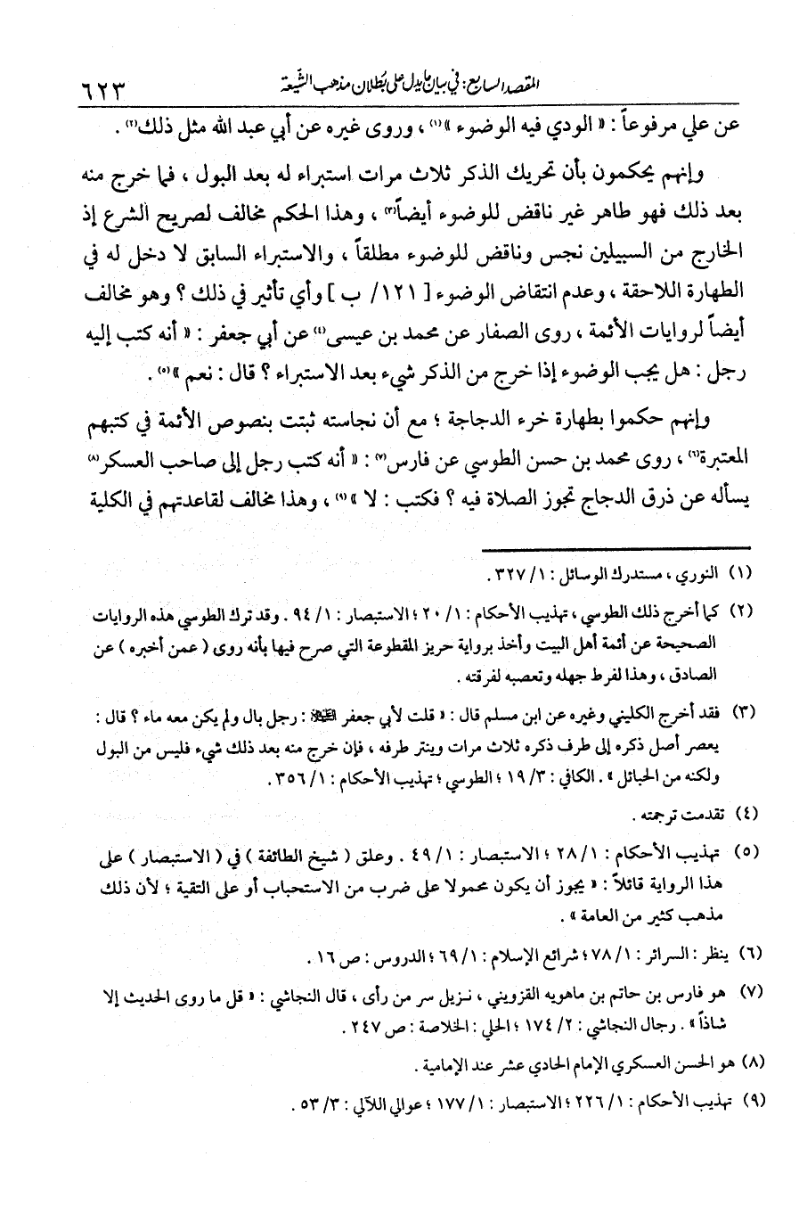 وإنهم يحكمون بأنَّ تحريك الذكر ثلاث مرات استبراء له بعد البول، فما خرج منه بعد ذلك فهو طاهر غير ناقض للوضوء أيضا. وهذا الحكم مخالف لصريح الشرع إذ الخارج من السبيلين نجسٌ وناقضٌ للوضوء مطلقا. والاستبراءُ السابق لا دخل له في الطهارة اللاحقة، وعدم انتقاض الوضوء وأي تأثير في ذلك؟ وهو مخالف أيضا لروايات الأئمة. روى الصفار عن محمد بن عيسى عن أبي جعفر: «أنه كتب إليه رجل: هل يجب الوضوء إذا خرج من الذكر شيء بعد الاستبراء؟ قال: نعم».