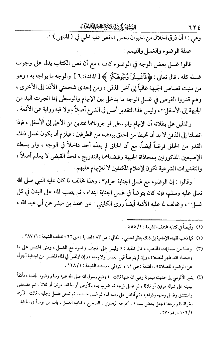 وقالوا: إن الوضوء مع غسل الجنابة حرام. وهذا مخالف لما كان عليه النبي - صلى الله عليه وسلم -، فإنه كان يتوضأ في غسل الجنابة ابتداء ثم يصب الماء على البدن في كل غسل. ومخالف لما عليه الأئمة أيضا، روى الكليني عن محمد بن مبشر عن أبي عبد الله