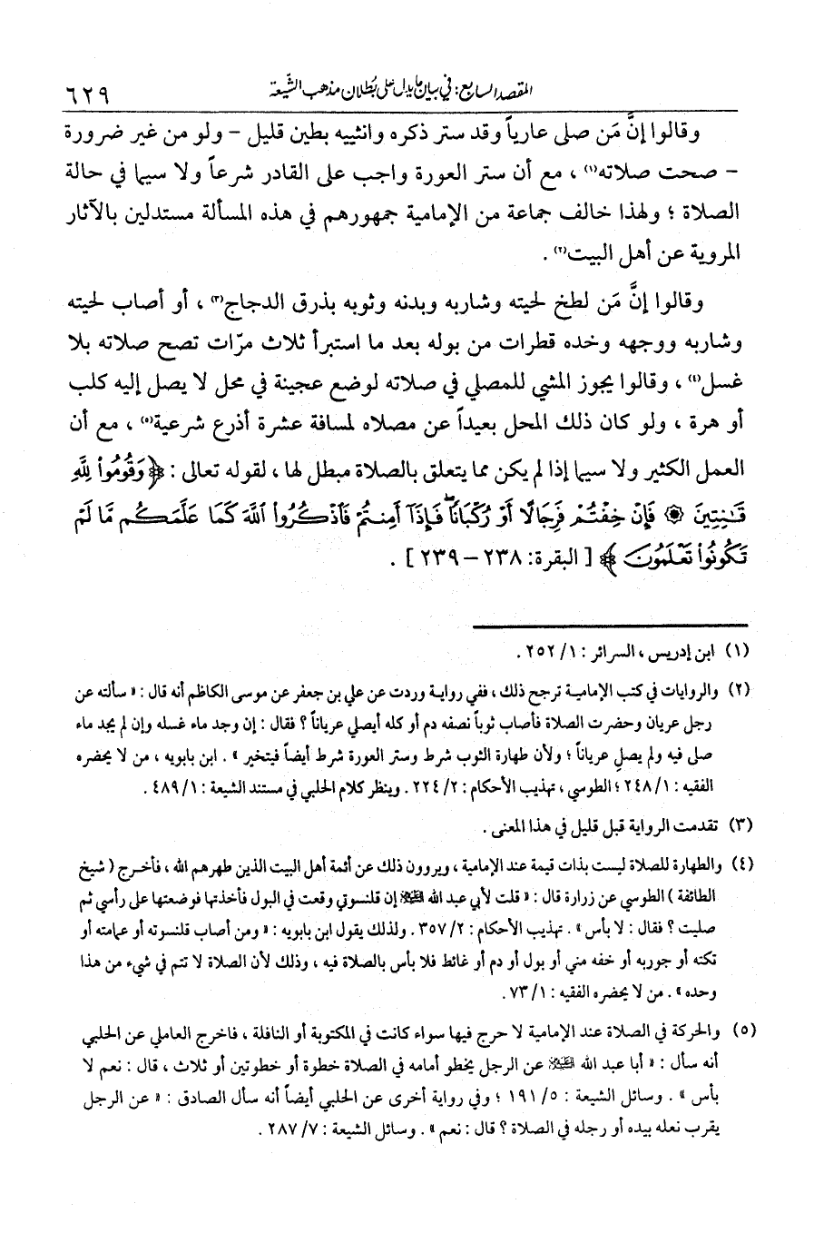 وقالوا: إنَّ مَن صلى عاريا وقد ستر ذكره وانثييه بطين قليل -ولو من غير ضرورة- صحت صلاته. مع أن ستر العورة واجبٌ على القادر شرعا، ولا سيما في حالة الصلاة. ولهذا خالف جماعة من الإمامية جمهورهم في هذه المسألة مستدلين بالآثار المروية عن أهل البيت.