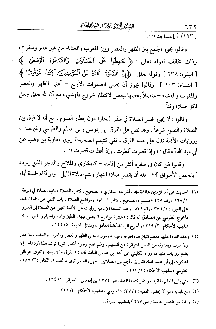 وقالوا: يجوز الجمع بين الظهر والعصر وبين المغرب والعشاء من غير عذر وسفر. وذلك مخالف لقوله تعالى: {حَافِظُوا عَلَى الصَّلَوَاتِ وَالصَّلاةِ الْوُسْطَى} وقوله تعالى: {إِنَّ الصَّلاةَ كَانَتْ عَلَى الْمُؤْمِنِينَ كِتَابًا مَوْقُوتًا}.