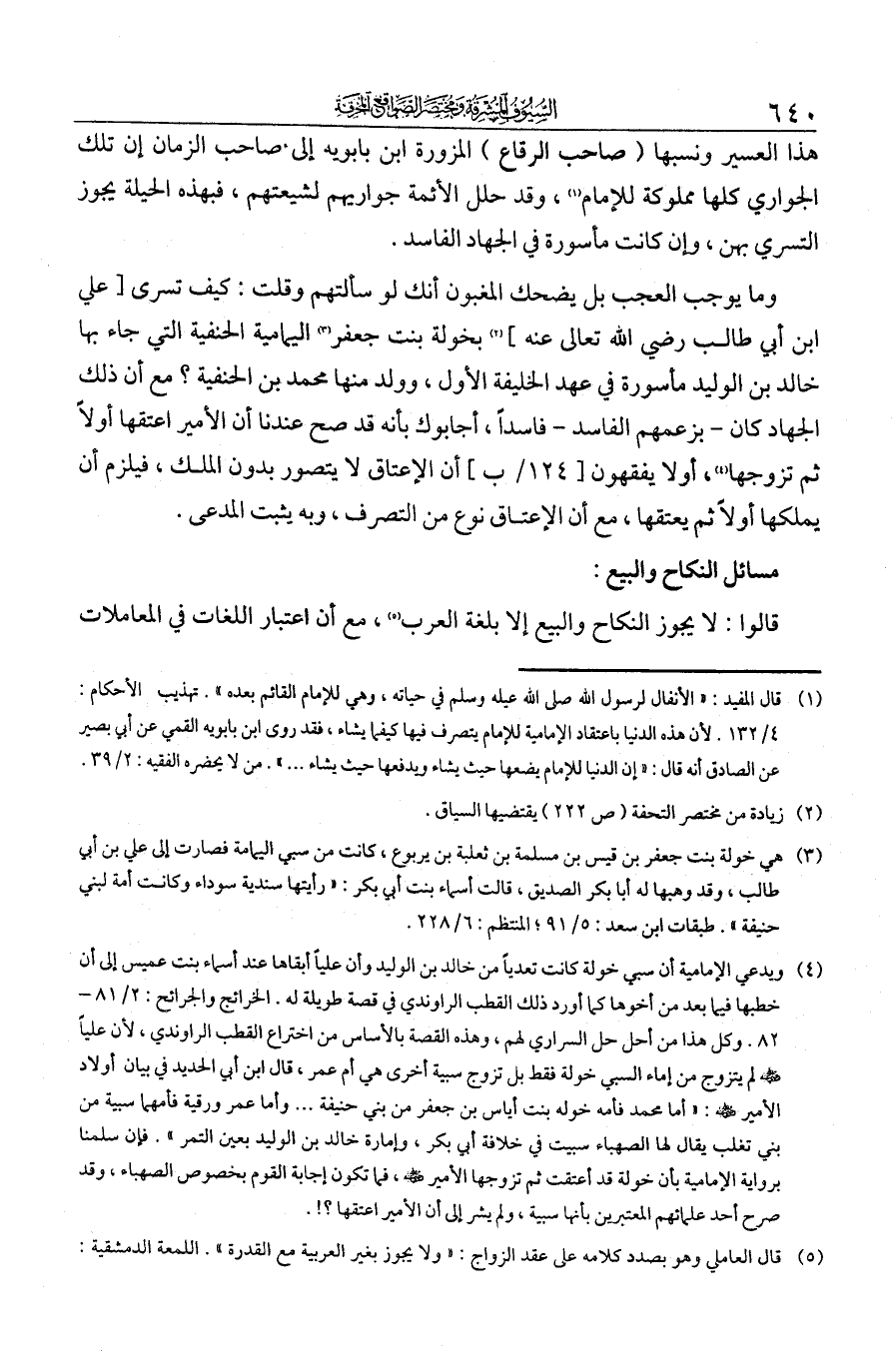 وما يوجب العجب، بل يضحك المغبون أنك لو سألتهم وقلت: كيف تسرى [علي بن أبي طالب رضي الله تعالى عنه] بخولة بنت جعفر اليمامية الحنفية التي جاء بها خالد بن الوليد مأسورة في عهد الخليفة الأول وولد منها محمد بن الحنفية، مع أن ذلك الجهاد كان بزعمهم الفاسد فاسدا؛ أجابوك بأنه قد صح عندنا أن الأمير أعتقها أولا ثم تزوجها. أولا يفقهون أن الإعتاق لا يتصور بدون الملك، فيلزم أن يملكها أولا ثم يعتقها، مع أن الإعتاق نوع من التصرف، وبه يثبت المدعى.