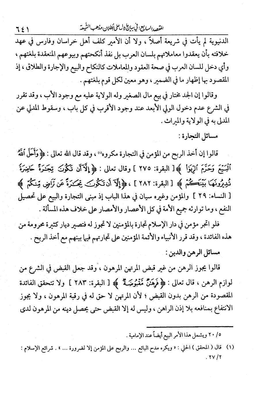 قالوا: إن أخذ الربح من المؤمن في التجارة مكروه، وقد قال الله تعالى: {وَأَحَلَّ اللَّهُ الْبَيْعَ وَحَرَّمَ الرِّبَا} وقال تعالى: {إلاَّ أَنْ تَكُونَ تِجَارَةً حَاضِرَةً تُدِيرُونَهَا بَيْنَكُمْ}، {إِلاَّ أَن تَكُونَ تِجَارَةً عَن تَرَاضٍ مِّنكُمْ}. والمؤمن وغيره سيان في هذا الباب، إذ مبنى التجارة والبيع على تحصيل النفع. وما توارثه جميع الأمة في كل الأعصار والأمصار على خلاف هذه المسألة. فلو اتجر مؤمن في دار الإسلام تجارة بالمؤمنين لا تجوز له فتصير ديار كثيرة محرومة من هذه الفائدة. وقد قرر الأنبياء والأئمة المؤمنين على تجارتهم فيما بينهم مع أخذ الربح.