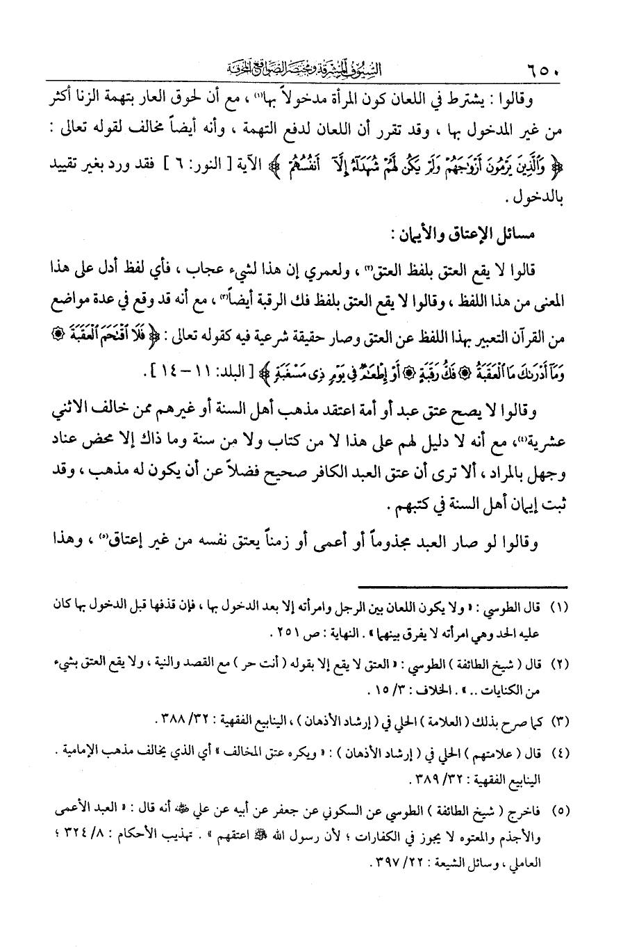 وقالوا: لا يصح عتق عبد أو أمة اعتقد مذهب أهل السنة أو غيرهم ممن خالف الاثني عشرية. مع أنه لا دليل لهم على هذا لا من كتاب ولا من سنة. وما ذاك إلا محض عناد وجهل بالمراد، ألا ترى أن عتق العبد الكافر صحي، فضلا عن أن يكون له مذهب. وقد ثبت إيمان أهل السنة في كتبهم.