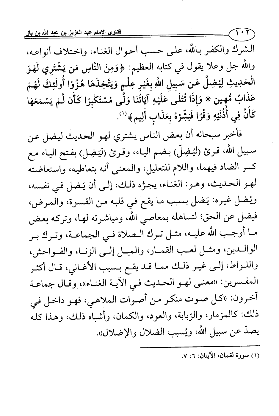 الشرك والكفر باللَّه، على حسب أحوال الغناء، واختلاف أنواعه، واللَّه جل وعلا يقول في كتابه العظيم: {وَمِنَ النَّاسِ مَن يَشْتَرِي لَهْوَ الْحَدِيثِ لِيُضِلَّ عَن سَبِيلِ اللَّهِ بِغَيْرِ عِلْمٍ وَيَتَّخِذَهَا هُزُوًا أُولَئِكَ لَهُمْ عَذَابٌ مُّهِين * وَإِذَا تُتْلَى عَلَيْهِ آيَاتُنَا وَلَّى مُسْتَكْبِرًا كَأَن لَّمْ يَسْمَعْهَا كَأَنَّ فِي أُذُنَيْهِ وَقْرًا فَبَشِّرْهُ بِعَذَابٍ أَلِيم} (¬1).