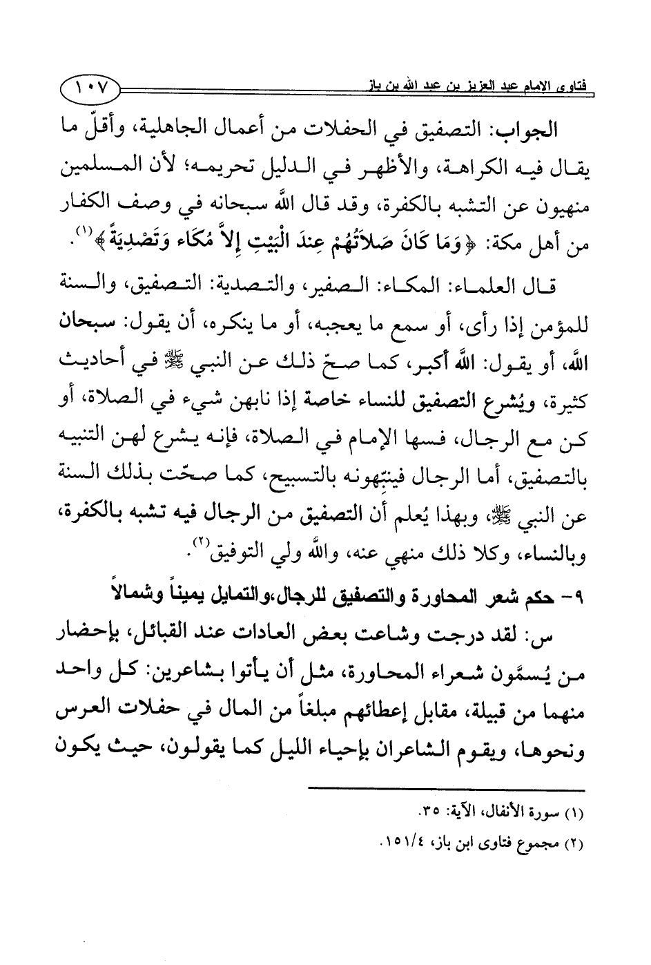 قال العلماء: المكاء: الصفير، والتصدية: التصفيق، والسنة للمؤمن إذا رأى، أو سمع ما يعجبه، أو ما ينكره، أن يقول: سبحان اللَّه، أو يقول: اللَّه أكبر، كما صحّ ذلك عن النبي - صلى الله عليه وسلم - في أحاديث كثيرة، ويُشرع التصفيق للنساء خاصة إذا نابهن شيء في الصلاة، أو كن مع الرجال، فسها الإمام في الصلاة، فإنه يشرع لهن التنبيه بالتصفيق، أما الرجال فينبِّهونه بالتسبيح، كما صحّت بذلك السنة عن النبي - صلى الله عليه وسلم -، وبهذا يُعلم أن التصفيق من الرجال فيه تشبه بالكفرة، وبالنساء، وكلا ذلك منهي عنه، واللَّه ولي التوفيق (¬2).