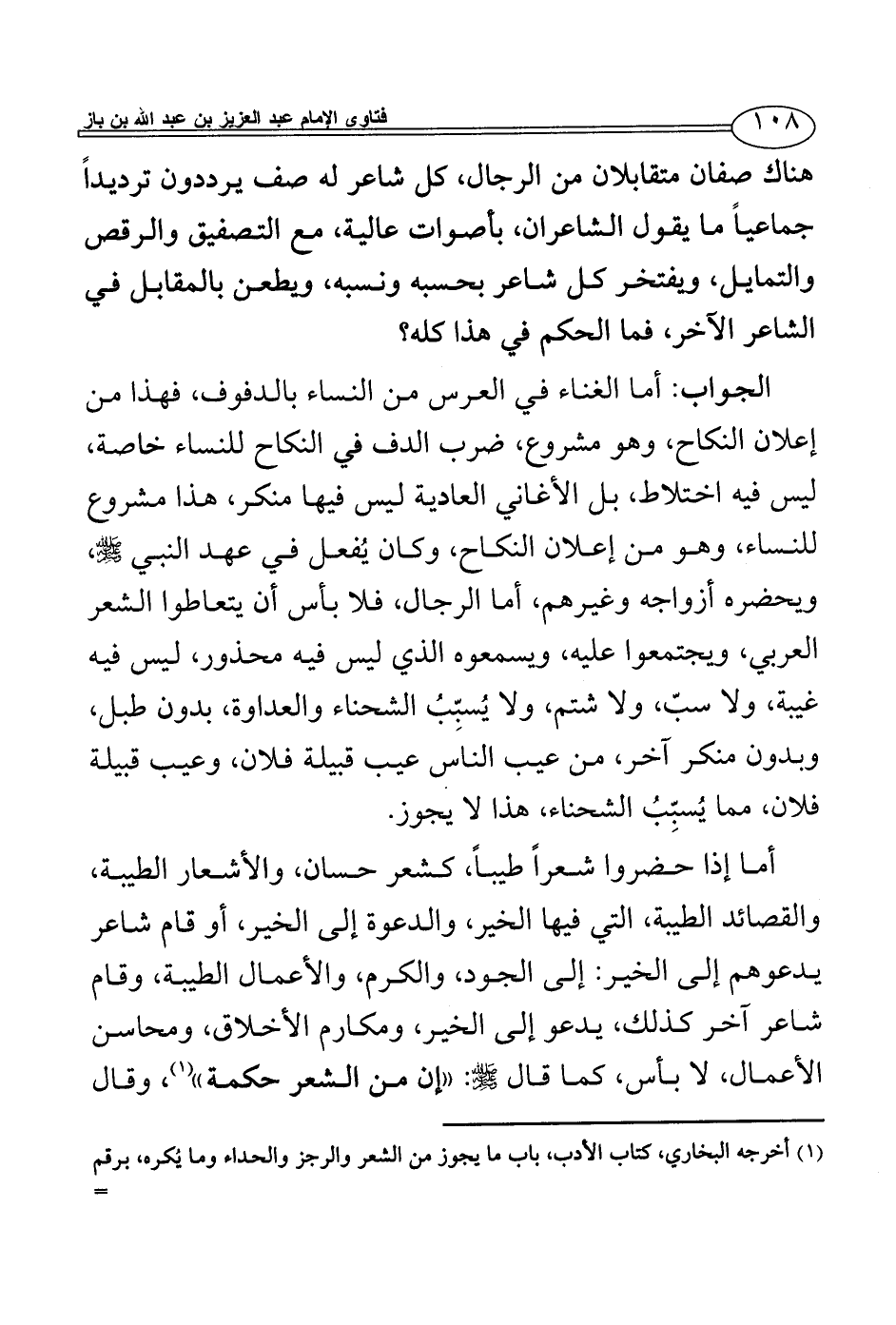 الجواب: أما الغناء في العرس من النساء بالدفوف، فهذا من إعلان النكاح، وهو مشروع، ضرب الدف في النكاح للنساء خاصة، ليس فيه اختلاط، بل الأغاني العادية ليس فيها منكر، هذا مشروع للنساء، وهو من إعلان النكاح، وكان يُفعل في عهد النبي - صلى الله عليه وسلم -، ويحضره أزواجه وغيرهم، أما الرجال، فلا بأس أن يتعاطوا الشعر العربي، ويجتمعوا عليه، ويسمعوه الذي ليس فيه محذور، ليس فيه غيبة، ولا سبّ، ولا شتم، ولا يُسبِّبُ الشحناء والعداوة، بدون طبل، وبدون منكر آخر، من عيب الناس عيب قبيلة فلان، وعيب قبيلة فلان، مما يُسبِّبُ الشحناء، هذا لا يجوز.