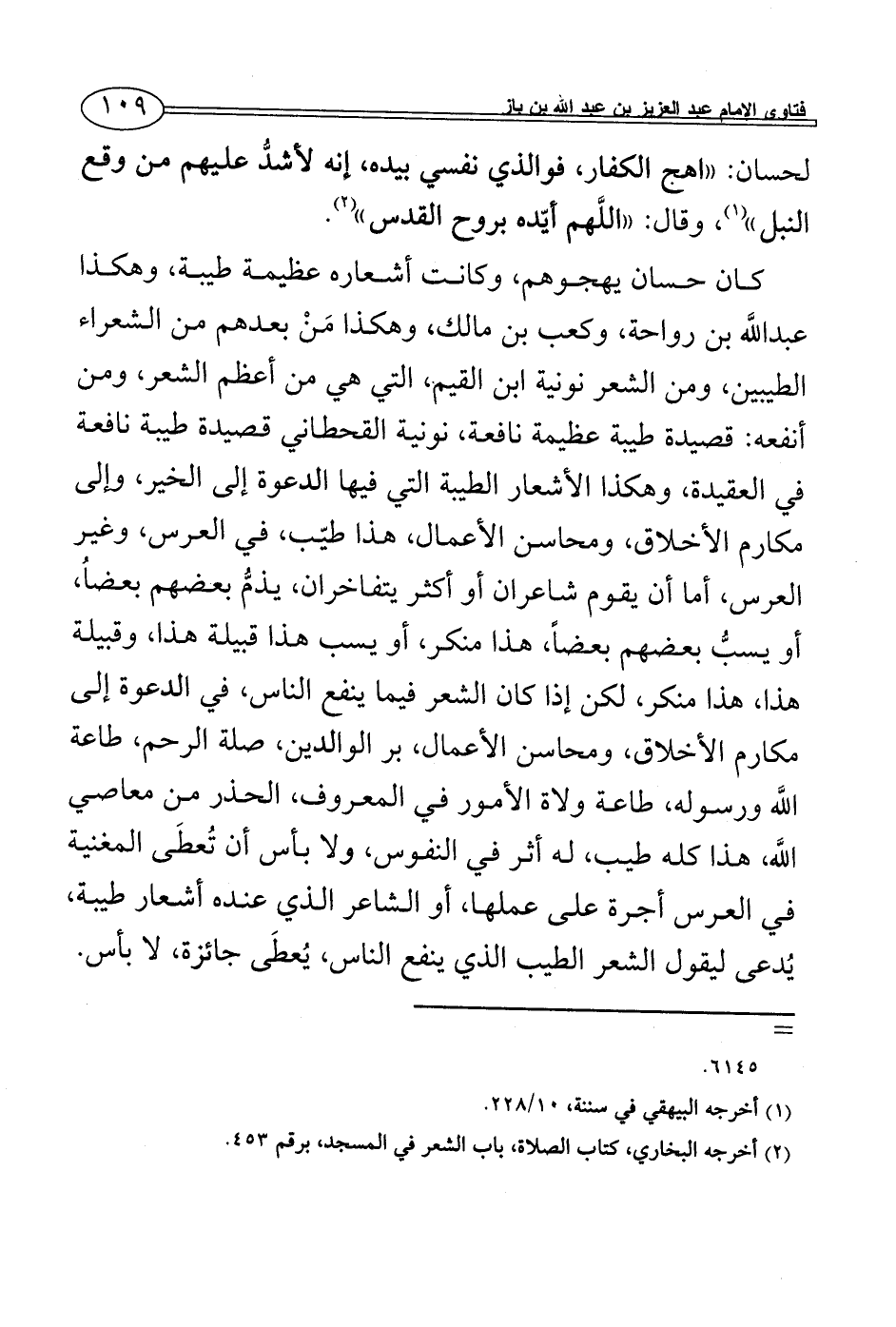 كان حسان يهجوهم، وكانت أشعاره عظيمة طيبة، وهكذا عبد اللَّه بن رواحة، وكعب بن مالك، وهكذا مَنْ بعدهم من الشعراء الطيبين، ومن الشعر نونية ابن القيم، التي هي من أعظم الشعر، ومن أنفعه: قصيدة طيبة عظيمة نافعة، نونية القحطاني قصيدة طيبة نافعة في العقيدة، وهكذا الأشعار الطيبة التي فيها الدعوة إلى الخير، وإلى مكارم الأخلاق، ومحاسن الأعمال، هذا طيّب، في العرس، وغير العرس، أما أن يقوم شاعران أو أكثر يتفاخران، يذمُّ بعضهم بعضاُ، أو يسبُّ بعضهم بعضاً، هذا منكر، أو يسب هذا قبيلة هذا، وقبيلة هذا، هذا منكر، لكن إذا كان الشعر فيما ينفع الناس، في الدعوة إلى مكارم الأخلاق، ومحاسن الأعمال، بر الوالدين، صلة الرحم، طاعة اللَّه ورسوله، طاعة ولاة الأمور في المعروف، الحذر من معاصي اللَّه، هذا كله طيب، له أثر في النفوس، ولا بأس أن تُعطَى المغنية في العرس أجرة على عملها، أو الشاعر الذي عنده أشعار طيبة، يُدعى ليقول الشعر الطيب الذي ينفع الناس، يُعطَى جائزة، لا بأس.