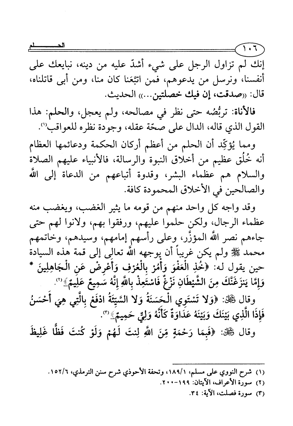وقد واجه كل واحد منهم من قومه ما يثير الغضب، ويغضب منه عظماء الرجال، ولكن حلموا عليهم، ورفقوا بهم، ولانوا لهم حتى جاءهم نصر اللَّه المؤزَّر، وعلى رأسهم إمامهم، وسيدهم، وخاتمهم محمد - صلى الله عليه وسلم - ولم يكن غريباً أن يوجهه اللَّه تعالى إلى قمة هذه السيادة حين يقول له: {خُذِ الْعَفْوَ وَأْمُرْ بِالْعُرْفِ وَأَعْرِضْ عَنِ الْجَاهِلِينَ * وَإِمَّا يَنزَغَنَّكَ مِنَ الشَّيْطَانِ نَزْغٌ فَاسْتَعِذْ بِاللَّهِ إِنَّهُ سَمِيعٌ عَلِيمٌ} (¬2).