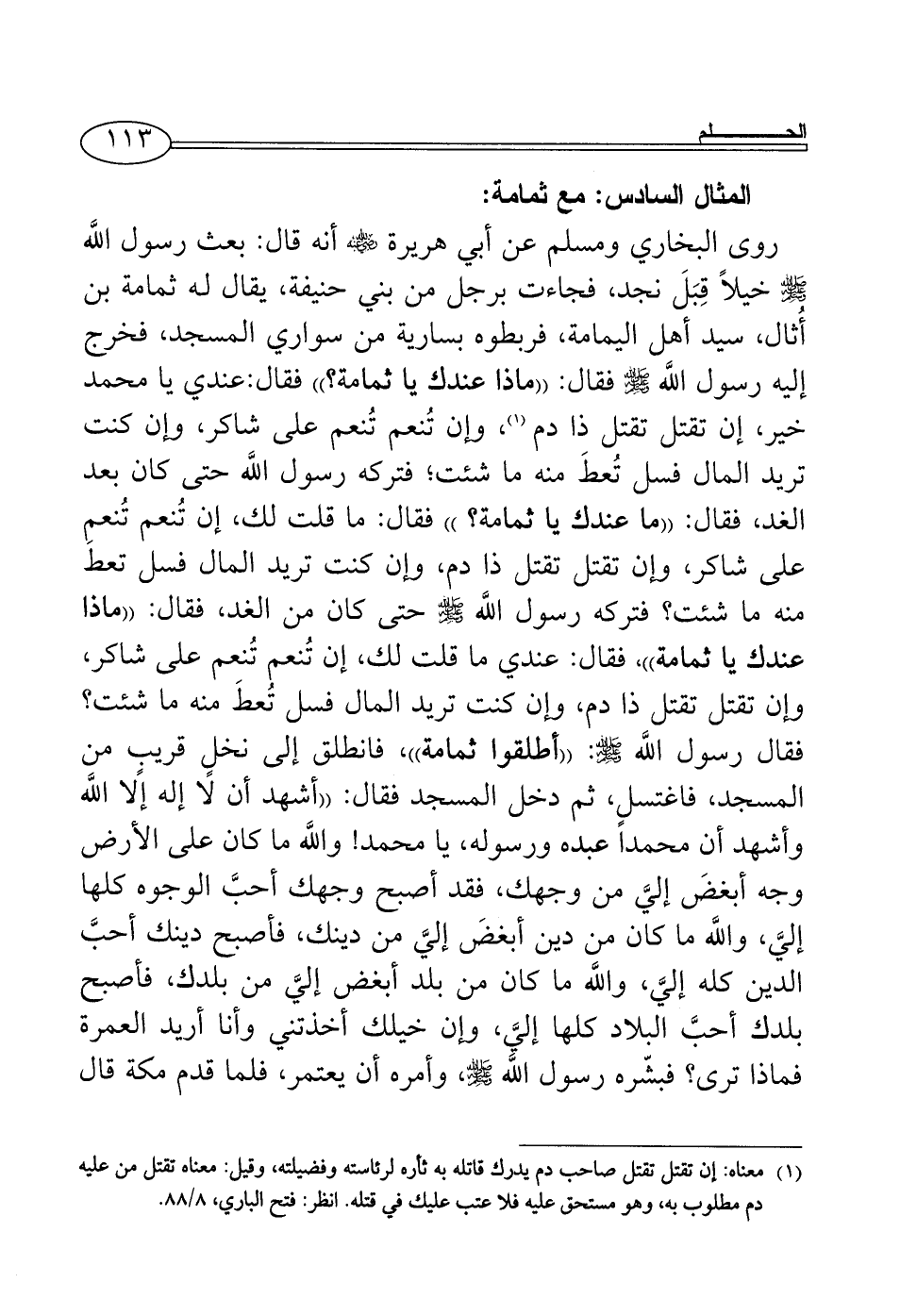 روى البخاري ومسلم عن أبي هريرة - رضي الله عنه - أنه قال: بعث رسول اللَّه - صلى الله عليه وسلم - خيلاً قِبَلَ نجد، فجاءت برجل من بني حنيفة، يقال له ثمامة بن أُثال، سيد أهل اليمامة، فربطوه بسارية من سواري المسجد، فخرج إليه رسول اللَّه - صلى الله عليه وسلم - فقال: ((ماذا عندك يا ثمامة؟)) فقال: عندي يا محمد خير، إن تقتل تقتل ذا دم (¬1)، وإن تُنعم تُنعم على شاكر، وإن كنت تريد المال فسل تُعطَ منه ما شئت؛ فتركه رسول اللَّه حتى كان بعد الغد، فقال: ((ما عندك يا ثمامة؟)) فقال: ما قلت لك، إن تُنعم تُنعم على شاكر، وإن تقتل تقتل ذا دم، وإن كنت تريد المال فسل تعطَ منه ما شئت؟ فتركه رسول اللَّه - صلى الله عليه وسلم - حتى كان من الغد، فقال: ((ماذا عندك يا ثمامة))، فقال: عندي ما قلت لك، إن تُنعم تُنعم على شاكر، وإن تقتل تقتل ذا دم، وإن كنت تريد المال فسل تُعطَ منه ما شئت؟ فقال رسول اللَّه - صلى الله عليه وسلم -: ((أطلقوا ثمامة)) , فانطلق إلى نخلٍ قريبٍ من المسجد، فاغتسل، ثم دخل المسجد فقال: ((أشهد أن لا إله إلا اللَّه وأشهد أن محمداً عبده ورسوله، يا محمد! واللَّه ما كان على الأرض وجه أبغضَ إليَّ من وجهك، فقد أصبح وجهك أحبَّ الوجوه كلها إليَّ، واللَّه ما كان من دين أبغضَ إليَّ من دينك، فأصبح دينك أحبَّ الدين كله إليَّ، واللَّه ما كان من بلد أبغض إليَّ من بلدك، فأصبح بلدك أحبَّ البلاد كلها إليَّ، وإن خيلك أخذتني وأنا أريد العمرة فماذا ترى؟ فبشّره رسول اللَّه - صلى الله عليه وسلم -، وأمره أن يعتمر، فلما قدم مكة قال