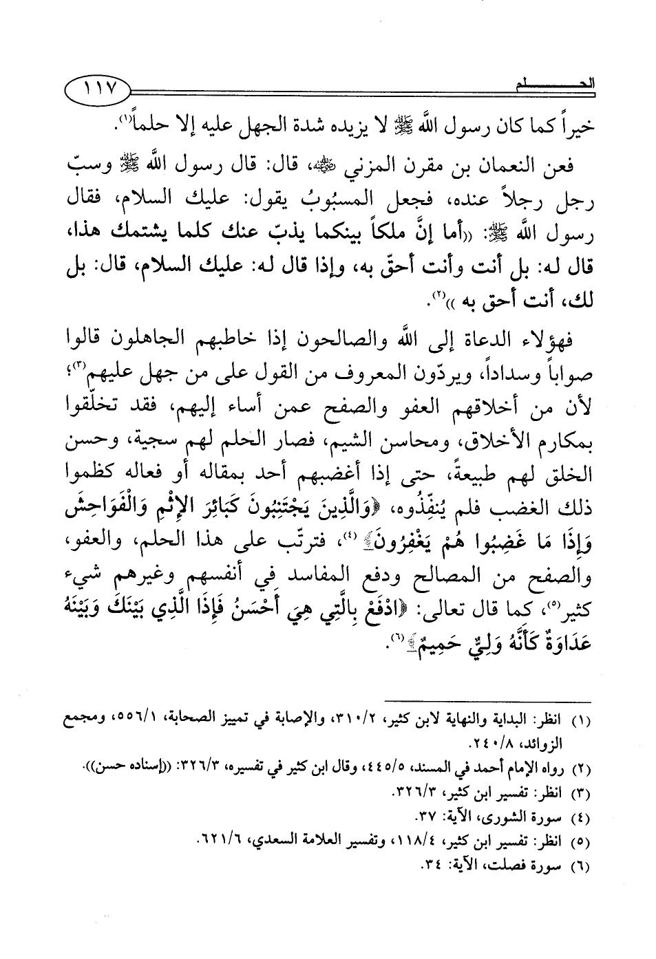 فهؤلاء الدعاة إلى اللَّه والصالحون إذا خاطبهم الجاهلون قالوا صواباً وسداداً، ويردّون المعروف من القول على من جهل عليهم (¬3)؛ لأن من أخلاقهم العفو والصفح عمن أساء إليهم، فقد تخلّقوا بمكارم الأخلاق، ومحاسن الشيم، فصار الحلم لهم سجية، وحسن الخلق لهم طبيعةً، حتى إذا أغضبهم أحد بمقاله أو فعاله كظموا ذلك الغضب فلم يُنفِّذُوه، {وَالَّذِينَ يَجْتَنِبُونَ كَبَائِرَ الإِثْمِ وَالْفَوَاحِشَ وَإِذَا مَا غَضِبُوا هُمْ يَغْفِرُونَ} (¬4)، فترتّب على هذا الحلم، والعفو، والصفح من المصالح ودفع المفاسد في أنفسهم وغيرهم شيء كثير (¬5)، كما قال تعالى: {ادْفَعْ بِالَّتِي هِيَ أَحْسَنُ فَإِذَا الَّذِي بَيْنَكَ وَبَيْنَهُ عَدَاوَةٌ كَأَنَّهُ وَلِيٌّ حَمِيمٌ} (¬6).