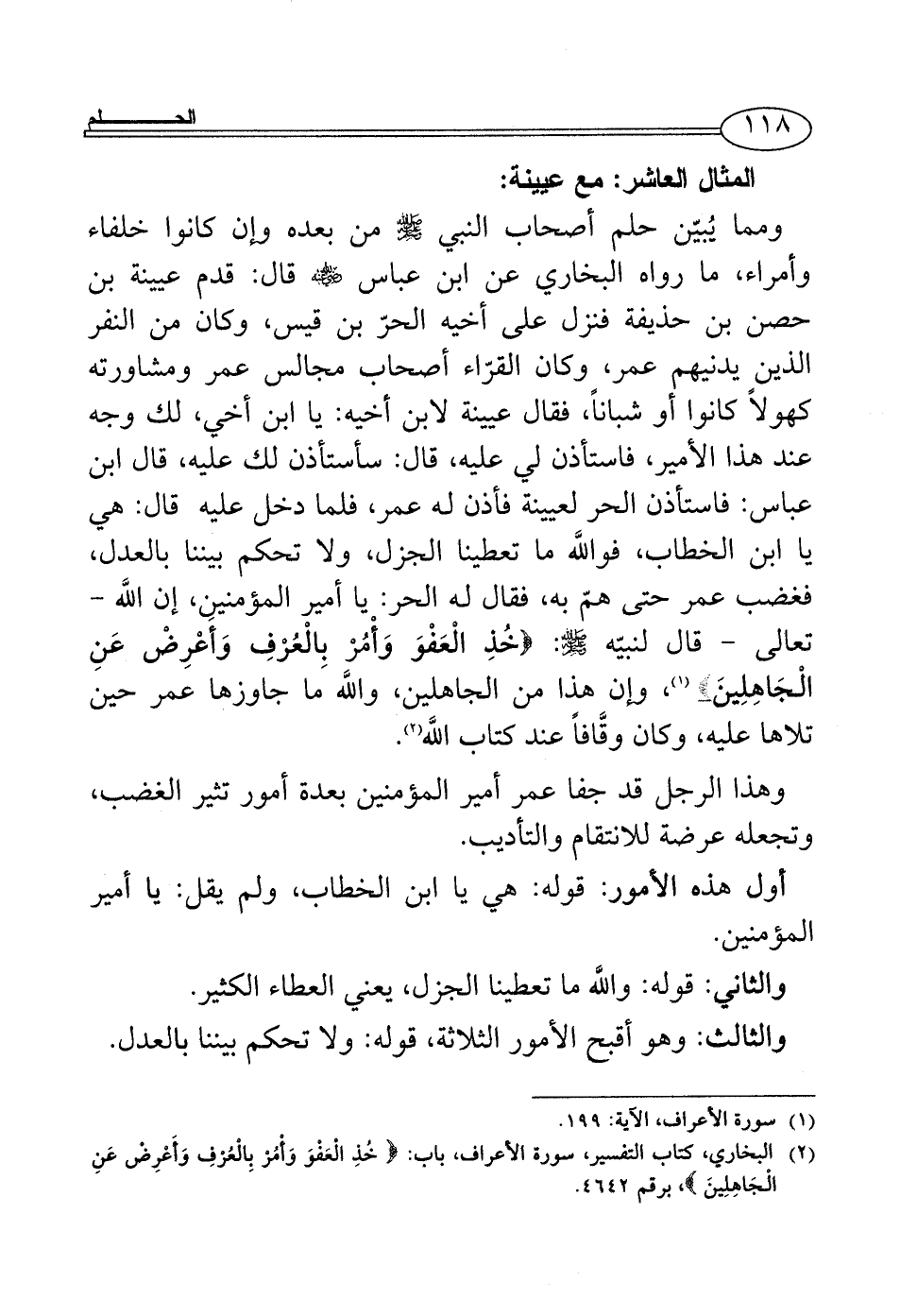 ومما يُبيّن حلم أصحاب النبي - صلى الله عليه وسلم - من بعده وإن كانوا خلفاء وأمراء، ما رواه البخاري عن ابن عباس - رضي الله عنه - قال: قدم عيينة بن حصن بن حذيفة فنزل على أخيه الحرّ بن قيس، وكان من النفر الذين يدنيهم عمر، وكان القرّاء أصحاب مجالس عمر ومشاورته كهولاً كانوا أو شباناً، فقال عيينة لابن أخيه: يا ابن أخي، لك وجه عند هذا الأمير، فاستأذن لي عليه، قال: سأستأذن لك عليه، قال ابن عباس: فاستأذن الحر لعيينة فأذن له عمر، فلما دخل عليه قال: هي يا ابن الخطاب، فواللَّه ما تعطينا الجزل، ولا تحكم بيننا بالعدل، فغضب عمر حتى همّ به، فقال له الحر: يا أمير المؤمنين، إن اللَّه - تعالى - قال لنبيّه - صلى الله عليه وسلم -: {خُذِ الْعَفْوَ وَأْمُرْ بِالْعُرْفِ وَأَعْرِضْ عَنِ الْجَاهِلِينَ} (¬1)، وإن هذا من الجاهلين، واللَّه ما جاوزها عمر حين تلاها عليه، وكان وقَّافاً عند كتاب اللَّه (¬2).