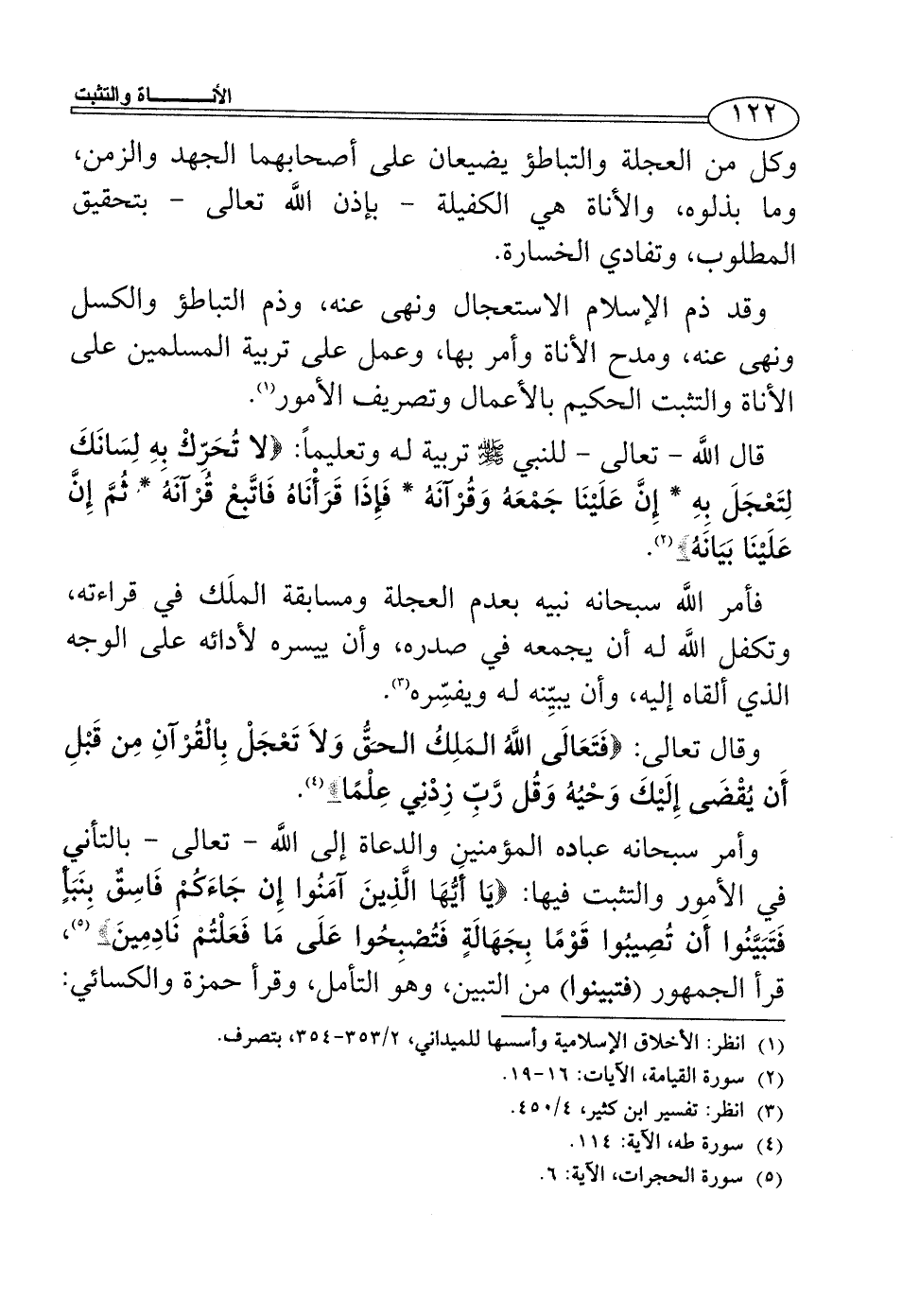 وقد ذم الإسلام الاستعجال ونهى عنه، وذم التباطؤ والكسل ونهى عنه، ومدح الأناة وأمر بها، وعمل على تربية المسلمين على الأناة والتثبت الحكيم بالأعمال وتصريف الأمور (¬1).