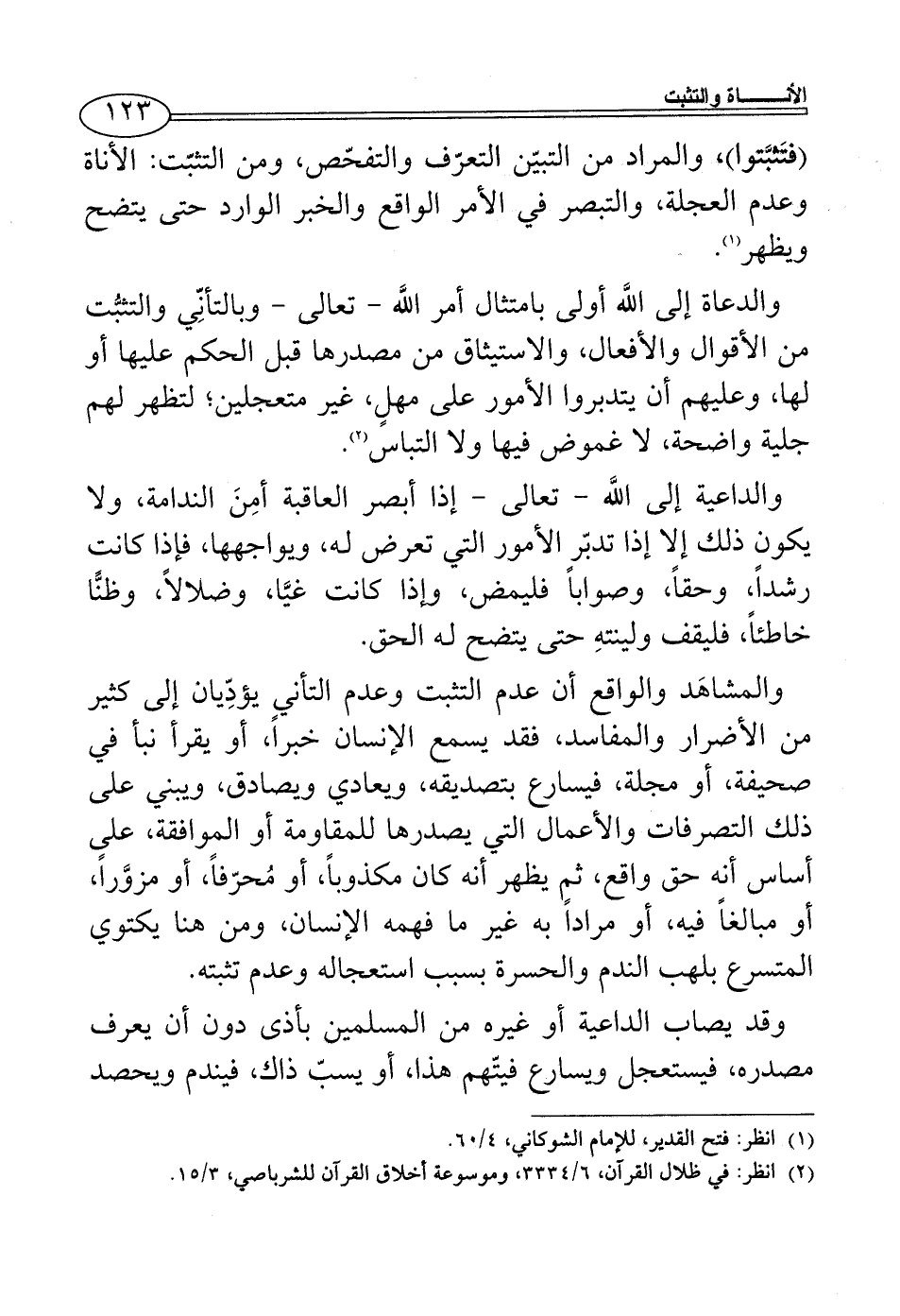 والدعاة إلى اللَّه أولى بامتثال أمر اللَّه - تعالى - وبالتأنِّي والتثبُّت من الأقوال والأفعال، والاستيثاق من مصدرها قبل الحكم عليها أو لها، وعليهم أن يتدبروا الأمور على مهلٍ، غير متعجلين؛ لتظهر لهم جلية واضحة، لا غموض فيها ولا التباس (¬2).