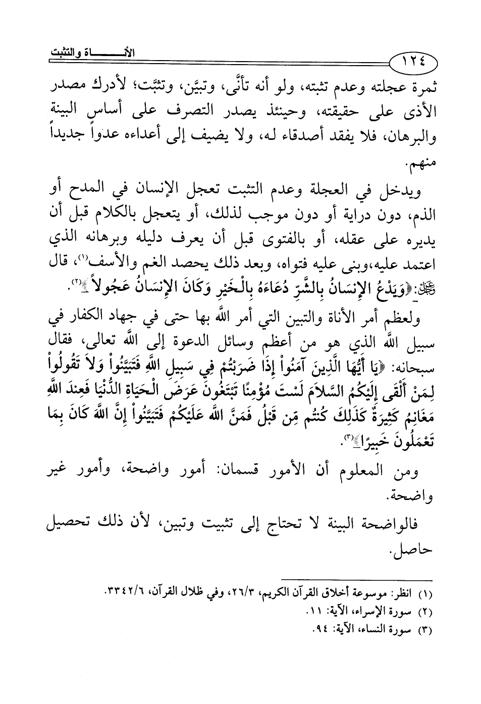 ولعظم أمر الأناة والتبين التي أمر اللَّه بها حتى في جهاد الكفار في سبيل اللَّه الذي هو من أعظم وسائل الدعوة إلى اللَّه تعالى، فقال سبحانه: {يَا أَيُّهَا الَّذِينَ آمَنُواْ إِذَا ضَرَبْتُمْ فِي سَبِيلِ اللَّهِ فَتَبَيَّنُواْ وَلاَ تَقُولُواْ لِمَنْ أَلْقَى إِلَيْكُمُ السَّلاَمَ لَسْتَ مُؤْمِنًا تَبْتَغُونَ عَرَضَ الْحَيَاةِ الدُّنْيَا فَعِندَ اللَّهِ مَغَانِمُ كَثِيرَةٌ كَذَلِكَ كُنتُم مِّن قَبْلُ فَمَنَّ اللَّه عَلَيْكُمْ فَتَبَيَّنُواْ إِنَّ اللَّهَ كَانَ بِمَا تَعْمَلُونَ خَبِيرًا} (¬3).