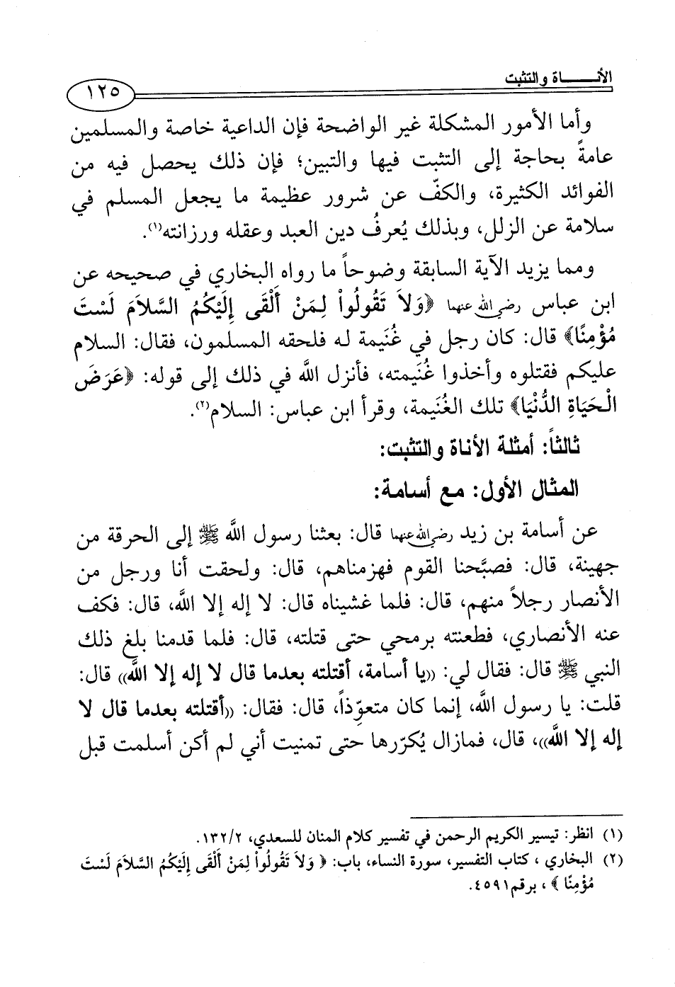 (¬2) البخاري، كتاب التفسير، سورة النساء، باب: {وَلاَ تَقُولُواْ لِمَنْ أَلْقَى إِلَيْكُمُ السَّلاَمَ لَسْتَ مُؤْمِنًا}، برقم4591.