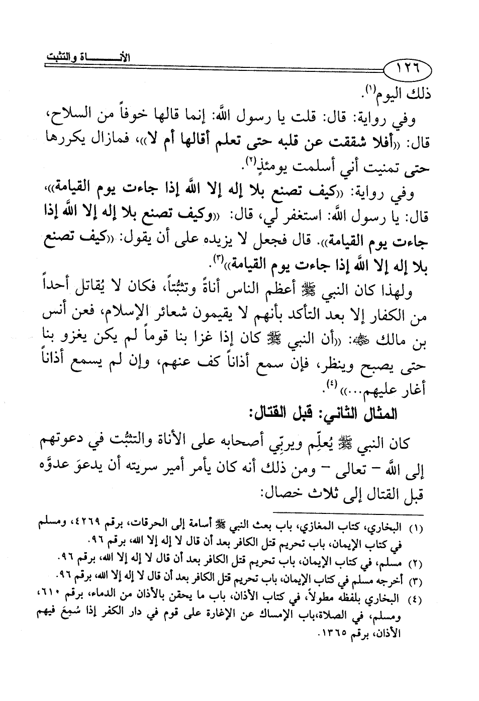 ولهذا كان النبي - صلى الله عليه وسلم - أعظم الناس أناةً وتثبُّتاً، فكان لا يُقاتل أحداً من الكفار إلا بعد التأكد بأنهم لا يقيمون شعائر الإسلام، فعن أنس بن مالك - رضي الله عنه -: ((أن النبي - صلى الله عليه وسلم - كان إذا غزا بنا قوماً لم يكن يغزو بنا حتى يصبح وينظر، فإن سمع أذاناً كف عنهم، وإن لم يسمع أذاناً أغار عليهم ... )) (¬4).