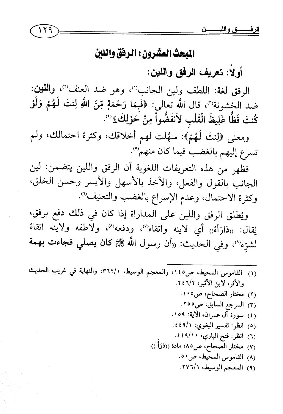 فظهر من هذه التعريفات اللغوية أن الرفق واللين يتضمن: لين الجانب بالقول والفعل، والأخذ بالأسهل والأيسر وحسن الخلق، وكثرة الاحتمال، وعدم الإسراع بالغضب والتعنيف (¬6).