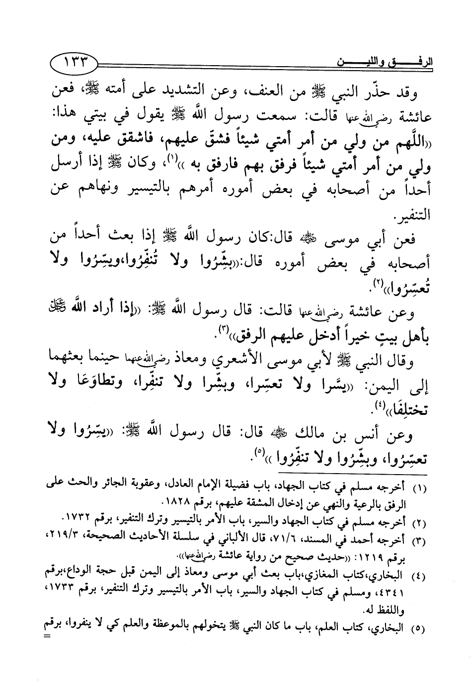 (¬5) البخاري، كتاب العلم، باب ما كان النبي - صلى الله عليه وسلم - يتخولهم بالموعظة والعلم كي لا ينفروا، برقم 69، ومسلم في كتاب الجهاد والسير، باب الأمر بالتيسير وترك التنفير، برقم 1734.