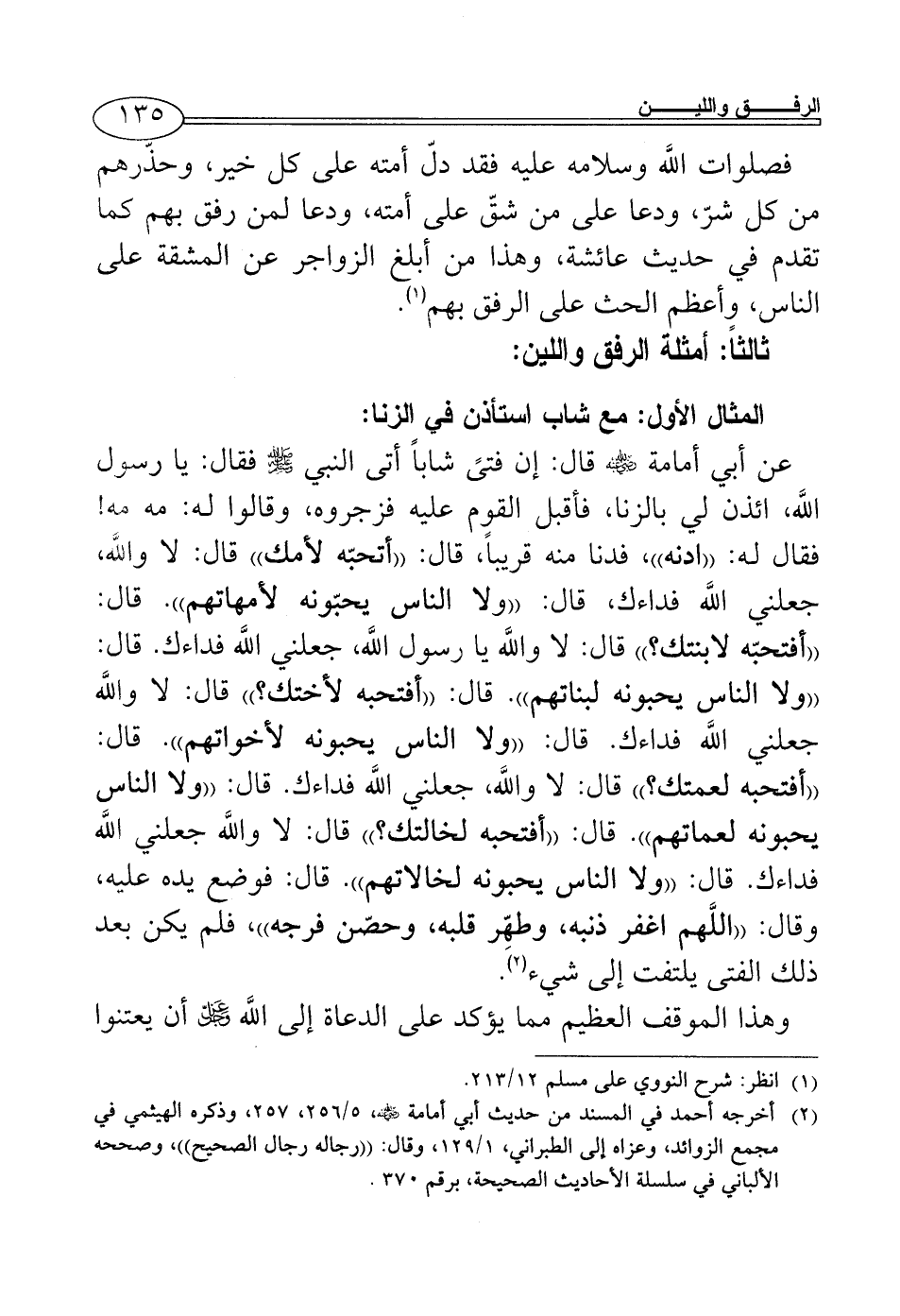 عن أبي أمامة - رضي الله عنه - قال: إن فتىً شاباً أتى النبي - صلى الله عليه وسلم - فقال: يا رسول اللَّه، ائذن لي بالزنا، فأقبل القوم عليه فزجروه، وقالوا له: مه مه! فقال له: ((ادنه))، فدنا منه قريباً، قال: ((أتحبّه لأمك)) قال: لا واللَّه، جعلني اللَّه فداءك، قال: ((ولا الناس يحبّونه لأمهاتهم)). قال: ((أفتحبّه لابنتك؟)) قال: لا واللَّه يا رسول اللَّه، جعلني اللَّه فداءك. قال: ((ولا الناس يحبونه لبناتهم)). قال: ((أفتحبه لأختك؟)) قال: لا واللَّه جعلني اللَّه فداءك. قال: ((ولا الناس يحبونه لأخواتهم)). قال: ((أفتحبه لعمتك؟)) قال: لا واللَّه، جعلني اللَّه فداءك. قال: ((ولا الناس يحبونه لعماتهم)). قال: ((أفتحبه لخالتك؟)) قال: لا واللَّه جعلني اللَّه فداءك. قال: ((ولا الناس يحبونه لخالاتهم)). قال: فوضع يده عليه، وقال: ((اللَّهم اغفر ذنبه، وطهِّر قلبه، وحصّن فرجه))، فلم يكن بعد ذلك الفتى يلتفت إلى شيء (¬2).