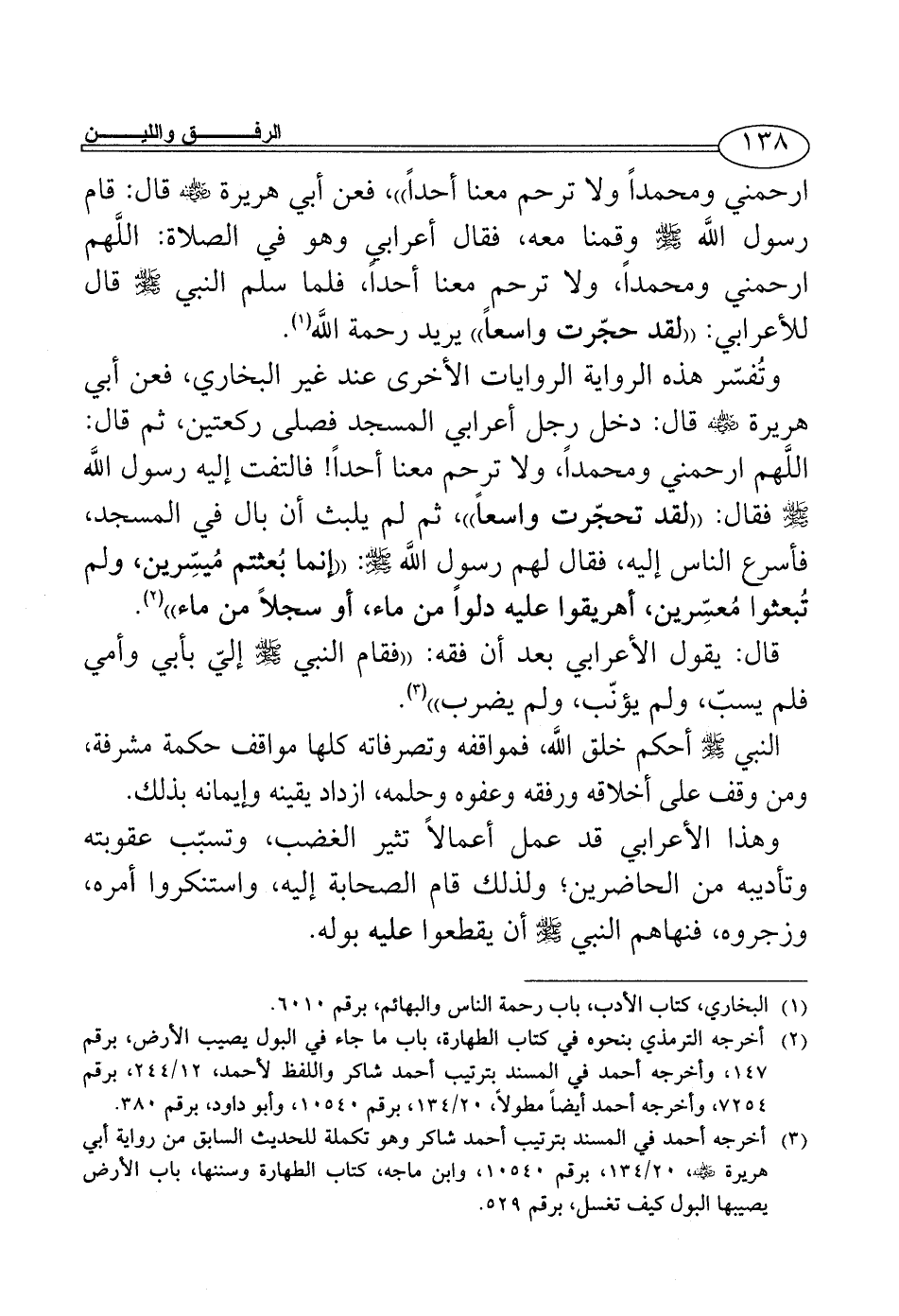 وتُفسّر هذه الرواية الروايات الأخرى عند غير البخاري، فعن أبي هريرة - رضي الله عنه - قال: دخل رجل أعرابي المسجد فصلى ركعتين، ثم قال: اللَّهم ارحمني ومحمداً، ولا ترحم معنا أحداً! فالتفت إليه رسول اللَّه - صلى الله عليه وسلم - فقال: ((لقد تحجّرت واسعاً))، ثم لم يلبث أن بال في المسجد، فأسرع الناس إليه، فقال لهم رسول اللَّه - صلى الله عليه وسلم -: ((إنما بُعثتم مُيسِّرين، ولم تُبعثوا مُعسِّرين، أهريقوا عليه دلواً من ماء، أو سجلاً من ماء)) (¬2).