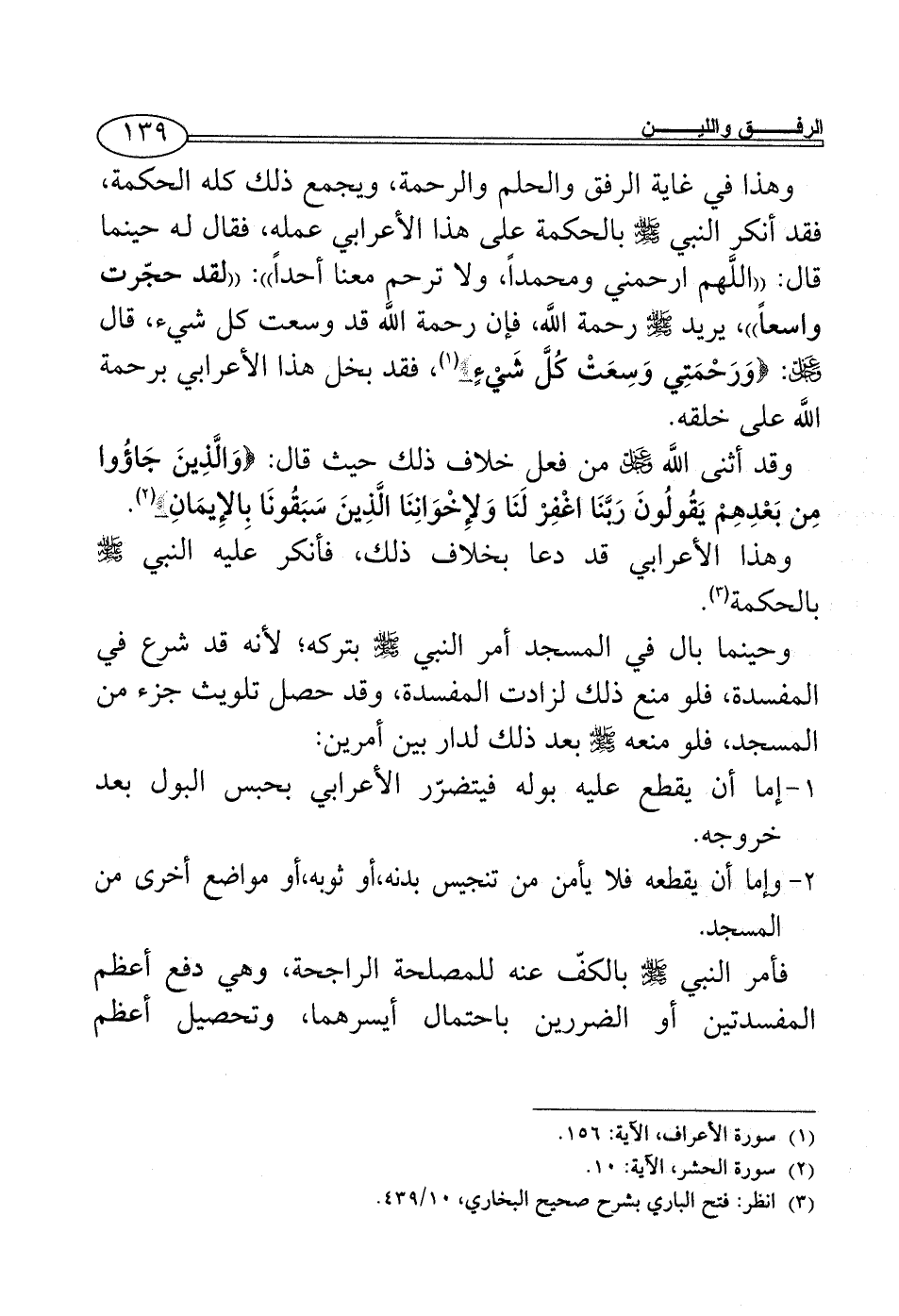 وهذا في غاية الرفق والحلم والرحمة، ويجمع ذلك كله الحكمة، فقد أنكر النبي - صلى الله عليه وسلم - بالحكمة على هذا الأعرابي عمله، فقال له حينما قال: ((اللَّهم ارحمني ومحمداً، ولا ترحم معنا أحداً)): ((لقد حجّرت واسعاً))، يريد - صلى الله عليه وسلم - رحمة اللَّه، فإن رحمة اللَّه قد وسعت كل شيء، قال - عز وجل -: {وَرَحْمَتِي وَسِعَتْ كُلَّ شَيْءٍ} (¬1)، فقد بخل هذا الأعرابي برحمة اللَّه على خلقه.