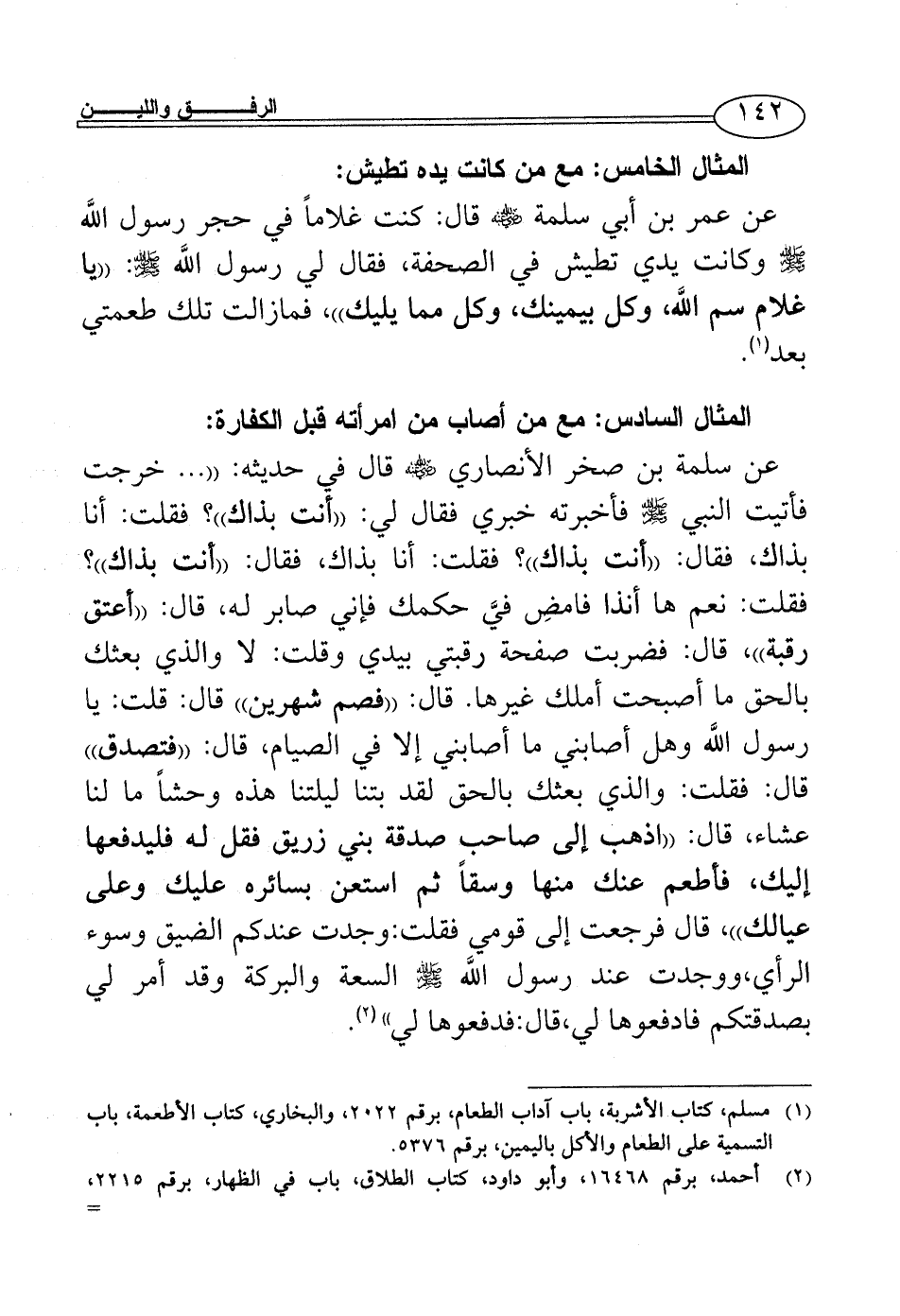 عن سلمة بن صخر الأنصاري - رضي الله عنه - قال في حديثه: (( ... خرجت فأتيت النبي - صلى الله عليه وسلم - فأخبرته خبري فقال لي: ((أنت بذاك))؟ فقلت: أنا بذاك، فقال: ((أنت بذاك))؟ فقلت: أنا بذاك، فقال: ((أنت بذاك))؟ فقلت: نعم ها أنذا فامضِ فيَّ حكمك فإني صابر له، قال: ((أعتق رقبة))، قال: فضربت صفحة رقبتي بيدي وقلت: لا والذي بعثك بالحق ما أصبحت أملك غيرها. قال: ((فصم شهرين)) قال: قلت: يا رسول اللَّه وهل أصابني ما أصابني إلا في الصيام، قال: ((فتصدق)) قال: فقلت: والذي بعثك بالحق لقد بتنا ليلتنا هذه وحشاً ما لنا عشاء، قال: ((اذهب إلى صاحب صدقة بني زريق فقل له فليدفعها إليك، فأطعم عنك منها وسقاً ثم استعن بسائره عليك وعلى عيالك))، قال فرجعت إلى قومي فقلت: وجدت عندكم الضيق وسوء الرأي، ووجدت عند رسول اللَّه - صلى الله عليه وسلم - السعة والبركة وقد أمر لي بصدقتكم فادفعوها لي، قال: فدفعوها لي)) (¬2).