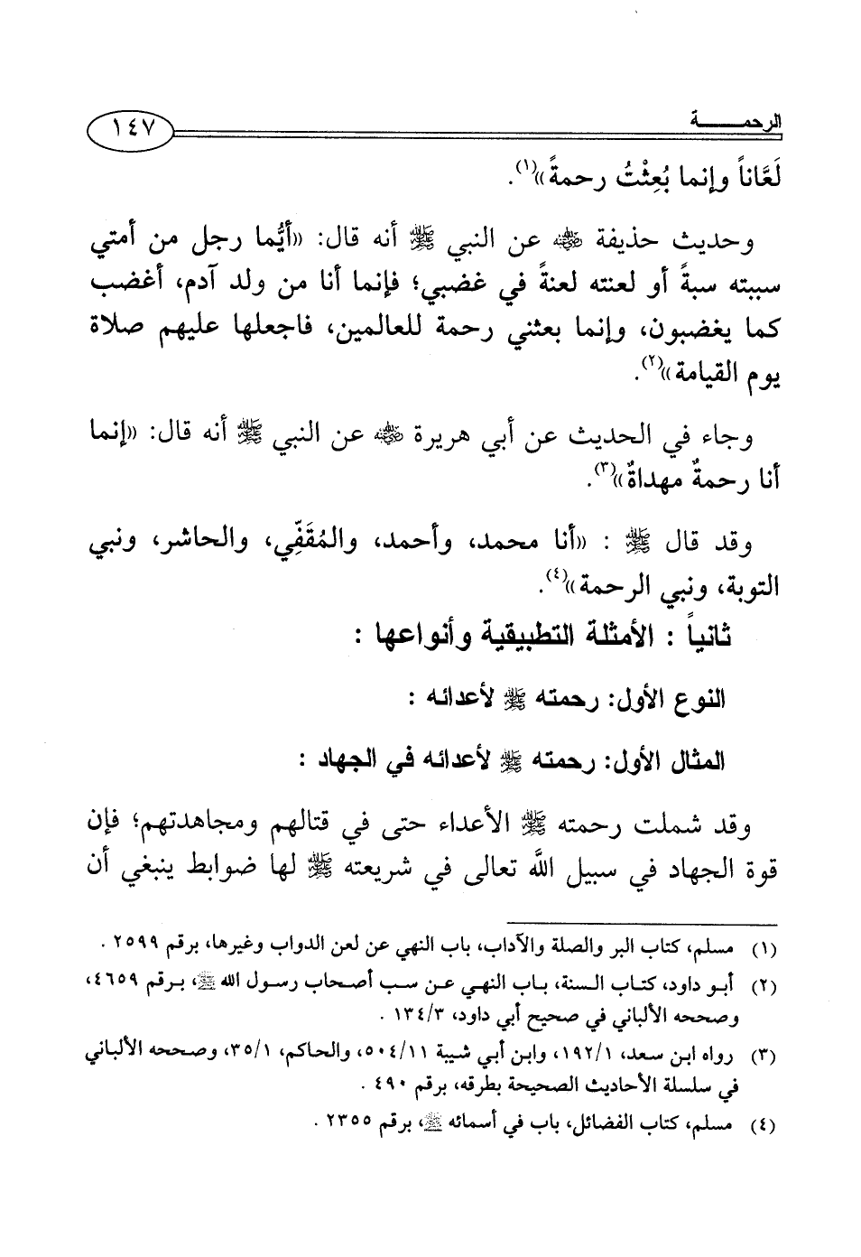 وقد شملت رحمته - صلى الله عليه وسلم - الأعداء حتى في قتالهم ومجاهدتهم؛ فإن قوة الجهاد في سبيل اللَّه تعالى في شريعته - صلى الله عليه وسلم - لها ضوابط ينبغي أن
